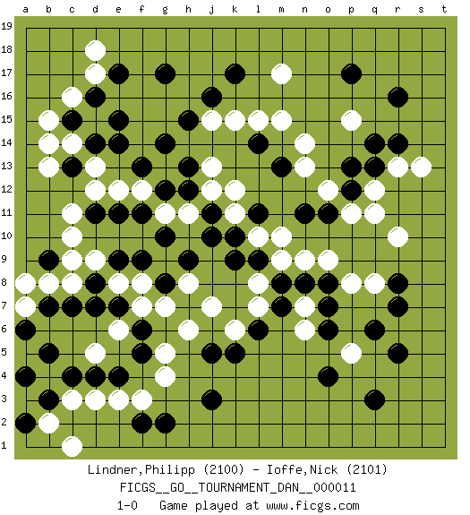 Last move : 1-0 2008 April 1 19:50:48 [Event "FICGS__GO__TOURNAMENT_DAN__000011"] [Site "FICGS"] [Date "2008.01.15"] [Round "1"] [Black "Lindner,Philipp"] [White "Ioffe,Nick"] [Result "1-0"] [Rating 1 "2100"] [Rating 2 "2101"] 1.r16 d17 2.q3 d3 3.p17 d15 4.r5 d5 5.j3 m17 6.k17 m15 7.g17 p15 8.q14 r10 9.r8 p5 10.o4 p8 11.q6 q8 12.r7 r13 13.q13 q12 14.p12 p11 15.o11 o12 16.p13 q11 17.r14 s13 18.n11 n13 19.m13 n14 20.o7 n9 21.l11 k15 22.j16 j15 23.l9 n7 24.o6 n6 25.o8 o9 26.n8 m9 27.m8 l8 28.k9 l7 29.m7 j7 30.h9 g7 31.h15 j12 32.f9 d9 33.g12 g13 34.f13 f12 35.h13 g11 36.h12 h11 37.j11 k12 38.f11 k11 39.j10 l10 40.l14 l15 41.k10 j13 42.g14 m10 43.e7 g4 44.c7 e12 45.e11 d12 46.b5 b4 47.c4 c3 48.b3 b2 49.a4 e6 50.g2 c10 51.d4 e3 52.j5 h6 53.e4 f3 54.a2 c1 55.f2 e8 56.d7 f8 57.l6 k6 58.k5 b8 59.d11 c11 60.d14 c14 61.c13 d13 62.e14 b13 63.c15 b14 64.d16 c16 65.e15 b15 66.e17 d18 67.b7 a7 68.a6 a8 69.f6 g5 70.b9 c8 71.d8 c9 72.e9 g9 73.g10 h8 74.g8 f7 75.f5 1-0 Here are the names of the openings (joseki) played in the four corners : Player Black won this Go (weiqi, baduk) game. Follow this game move after move (download)To invade, need 20 points in open area; otherwise, keshi is best. (Yang Yilun, 7p) The hypothalamus is one of the most important parts of the brain, involved in many kinds of motivation, among other functions. The hypothalamus controls the 'Four Fs: Fighting, Fleeing, Feeding and Mating. (Unknown author)