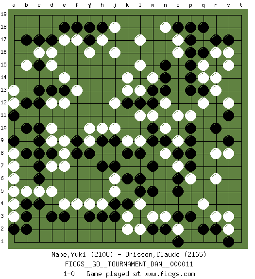 Last move : 1-0 2008 May 23 12:32:0 [Event "FICGS__GO__TOURNAMENT_DAN__000011"] [Site "FICGS"] [Date "2008.01.15"] [Round "1"] [Black "Nabe,Yuki"] [White "Brisson,Claude"] [Result "1-0"] [Rating 1 "2108"] [Rating 2 "2165"] 1.q16 q4 2.d17 c5 3.d3 e4 4.e3 f4 5.g3 g4 6.h3 h4 7.j4 j5 8.k4 d15 9.c13 e14 10.c10 f17 11.f18 e17 12.e18 d16 13.c17 b15 14.c7 d9 15.c9 d7 16.d8 e8 17.c8 e7 18.o3 r6 19.q2 r3 20.r10 o17 21.p18 l17 22.o18 h17 23.q13 r16 24.r15 q17 25.r17 s16 26.p17 q15 27.q18 r14 28.s17 s15 29.p15 q14 30.p14 r13 31.o5 q12 32.p13 r8 33.p10 p11 34.p9 o11 35.m9 m3 36.m5 o2 37.p3 l4 38.l5 k3 39.j3 k2 40.n2 k9 41.j7 k7 42.k6 j6 43.k8 l7 44.l8 j8 45.h7 h8 46.m7 l9 47.l6 o16 48.p16 d12 49.c12 d10 50.g8 g9 51.j9 j10 52.h9 h10 53.m10 l11 54.m13 l13 55.l14 k14 56.l12 k13 57.k12 j12 58.m12 l15 59.h18 j18 60.g17 g16 61.g18 j16 62.d13 e12 63.e13 f13 64.s9 m11 65.n15 m14 66.n14 n12 67.n13 s8 68.s11 s12 69.r2 s2 70.s1 s3 71.c6 d5 72.b4 b5 73.c4 n8 74.p7 n10 75.n9 o9 76.o8 o7 77.p8 p6 78.o6 a8 79.b8 a7 80.a9 a6 81.b10 a4 82.b3 a3 83.a2 a5 84.b2 a12 85.b12 a13 86.a11 n3 87.m2 l2 88.o1 n18 89.f9 g10 90.f8 e9 91.c15 c16 92.b17 1-0 Here are the names of the openings (joseki) played in the four corners : Corner d4 : c5 d3 Mokuhazushi (Waemok, Wai`mu`) 5-3 Point. The mokuhazushi (5-3) point was popular in the Edo period in Japan (1600 - 1867). It emphasizes influence; territorially, it is inferior to the 3-4 point. Komoku Kakari. Black 2 is the standard approach because of its solidity and stability. Corner d16 : d17 d15 Komoku (Somok, Xiao~mu`) 3-4 Point. The komoku (3-4) point is the traditional corner enclosure move.. Ikken Takagakari (Hankan Nop'dakeolch'im, Yi Gaogua`jiao~, 1-Space High Approach). The 5-4 approach move has become more popular in modern times, as modern Go emphasizes speed and influence. Corner q4 : q4 o3 Hoshi (Hwajeom, Seongjeom, Xingwei`) 4-4 Point. The star or hoshi (4-4) point, emphasizing influence at the potential expense of territory. Ikken Kakari (Hankan Keolch'im, Yi Gua`jiao~, 1-Space Low Approach). Black 2 is the standard approach move to the 4-4. Corner q16 : q16 o17 Hoshi (Hwajeom, Seongjeom, Xingwei`) 4-4 Point. The star or hoshi (4-4) point, emphasizing influence at the potential expense of territory. Ikken Kakari (Hankan Keolch'im, Yi Gua`jiao~, 1-Space Low Approach). White 2 is the standard approach move to the 4-4. Player Black won this Go (weiqi, baduk) game. Follow this game move after move (download)Each step in a ladder is worth 7 points. (Anonymous) Dave, my mind is going. I can feel it. (HAL 9000 in 2001, a space odyssey)