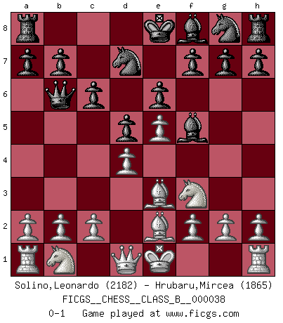 Last move : 0-1 2008 March 10 3:53:29 [Event "FICGS__CHESS__CLASS_B__000038"] [Site "FICGS"] [Date "2008.01.16"] [Round "1"] [White "Solino,Leonardo"] [Black "Hrubaru,Mircea"] [Result "0-1"] [WhiteElo "2182"] [BlackElo "1865"] 1.e4 c6 2.d4 d5 3.e5 Bf5 4.Nf3 e6 5.Be2 Nd7 6.Be3 Qb6 0-1 This chess game has been lost on time (started : 2008.01.16 8:19:29) Caro-Kann : Advance variation Player Black won this chess game. Follow this game move after move (download)On the chessboard, lies and hypocrisy do not survive long. (Emanuel Lasker) Spielt Blackmar-Diemer-Gambit, und das Matt kommt von selbst! (Emil Joseph Diemer) Solo los afeminados hacen el Enroque. (Rob Sillars) Les échecs sont un jeu par leur forme, un art par leur essence et une science par sa difficulté d'acquisition. Ils peuvent vous procurer autant de plaisir qu'un bon livre ou une belle musique, mais vous n'aurez une réelle joie que si vous arrivez à bien jouer. (Tigran Petrosian) Good decisions come from experience, and experience comes from bad decisions. (Anonymous)
