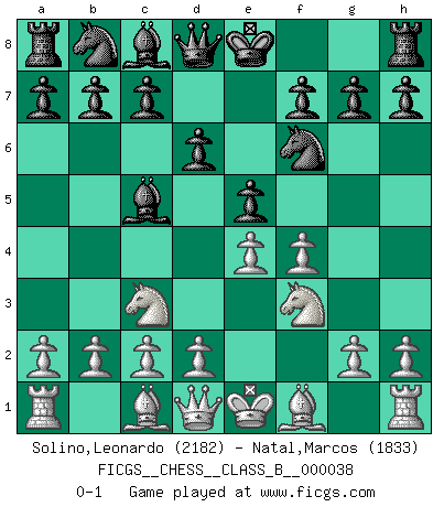 Last move : 0-1 2008 March 30 18:37:57 [Event "FICGS__CHESS__CLASS_B__000038"] [Site "FICGS"] [Date "2008.01.16"] [Round "1"] [White "Solino,Leonardo"] [Black "Natal,Marcos"] [Result "0-1"] [WhiteElo "2182"] [BlackElo "1833"] 1.e4 e5 2.f4 Bc5 3.Nf3 d6 4.Nc3 Nf6 0-1 This chess game has been lost on time (started : 2008.01.16 8:19:29) KGD : Classical variation Player Black won this chess game. Follow this game move after move (download)In Chess, just as in life, today's bliss may be tomorrow's poison. (Assaic) In der Schule lernt man nichts. Es ist nur Zeitverschwendung. (Robert James Fischer) Un mal plan es mejor que no tener ningún plan. (Frank Marshall) On n'a jamais que l'âge auquel on a commence à jouer aux échecs car après on cesse de vieillir. (Capablanca) Nowadays, anyone who cannot speak English and is incapable of using the Internet is regarded as backward. (Al-Waleed bin Talal)