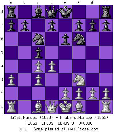 Last move : 0-1 2008 March 20 16:47:45 [Event "FICGS__CHESS__CLASS_B__000038"] [Site "FICGS"] [Date "2008.01.16"] [Round "1"] [White "Natal,Marcos"] [Black "Hrubaru,Mircea"] [Result "0-1"] [WhiteElo "1833"] [BlackElo "1865"] 1.d4 Nf6 2.c4 e6 3.Nc3 Bb4 4.a3 Bxc3+ 5.bxc3 c5 6.Nf3 Nc6 0-1 This chess game has been lost on time (started : 2008.01.16 8:19:29) Nimzo-Indian : Saemisch variation Player Black won this chess game. Follow this game move after move (download)Chess is a terrible game. If you have no center, your opponent has a freer position. If you do have a center, then you really have something to worry about ! (Siegbert Tarrasch) Ohne Leiden bildet sich kein Charakter. (Ernst Freiherr von Feuchtersleben) Yo tuve un dolor de muelas en la primer partida. En el segundo juego, tuve un dolor de cabeza. En el tercero, tuve un ataque de reumatísmo. En la cuarta partida, no me sentía muy bien. ¿Y en el quinto juego? Bueno, ¿que acaso uno tiene que ganar todos los juegos?. (Siegbert Tarrasch) Le joueur d'Echecs qui veut atteindre le top est obligé de développer son propre credo créatif. Alexeï Stepanovicth Souétine. Il est facile d'écrire des livres ! Ce qui est difficile, c'est de jouer ! (Alexeï Stepanovicth Souétine) Just because you do not take an interest in politics doesn't mean politics won't take an interest in you. (Pericles 430 B.C.)