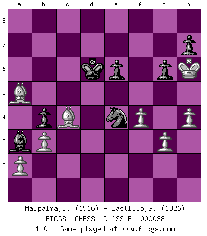 Last move : 1-0 2008 July 1 13:58:15 [Event "FICGS__CHESS__CLASS_B__000038"] [Site "FICGS"] [Date "2008.01.16"] [Round "1"] [White "Malpalma,Joaquim"] [Black "Castillo,German"] [Result "1-0"] [WhiteElo "1916"] [BlackElo "1826"] 1.c4 Nf6 2.Nc3 g6 3.e4 d6 4.d4 Bg7 5.Nf3 O-O 6.Be2 c5 7.O-O cxd4 8.Nxd4 Nc6 9.Be3 Bd7 10.Qd2 Nxd4 11.Bxd4 Bc6 12.f3 a5 13.b3 Nd7 14.Bf2 Nc5 15.Rab1 Qc7 16.Rfc1 Rfc8 17.Nd5 Qd8 18.Bh4 Bxd5 19.cxd5 Be5 20.Bg5 Qb6 21.Be3 Qb4 22.Rc4 Qxd2 23.Bxd2 b5 24.Rc2 b4 25.Rc4 Nd7 26.Rbc1 Rxc4 27.Rxc4 Nc5 28.g3 e6 29.dxe6 fxe6 30.Kg2 Rc8 31.Be3 Kf7 32.f4 Bc3 33.e5 Ke7 34.Kf3 Bb2 35.h4 Rc7 36.Kg4 Na6 37.Bb6 Rxc4 38.Bxc4 Nc5 39.Bxa5 Ba3 40.exd6+ Kxd6 41.Kg5 Ne4+ 42.Kh6 1-0 English Opening Kingside Castling by player Black (move 5) Kingside Castling by player White (move 7) Player White won this chess game. Follow this game move after move (download)Suddenly it was obvious to me in my analysis I had missed what Fischer had found with the greatest of ease at the board. (Mikhail Botvinnik) Kombinieren und Schwarzhandel gehören verboten. (Savielly Grigorievitsch Tartakower) El tablero es el mundo, las piezas es el fenomeno del universo, las reglas del juego son lo que llamamos leyes de la naturaleza y el jugador del lado opuesto, se encuentra oculto a nuestra vista. (Thomas Huxley) La tactique est l'élément le plus important du milieu de jeu. (Siegbert Tarrasch) The intuitive mind is a sacred gift; the rational mind is a faithful servant. We have created a society that honors the servant but has forgotten the gift. (Albert Einstein)