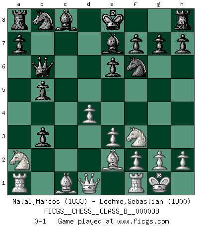 Last move : 0-1 2008 April 29 20:56:1 [Event "FICGS__CHESS__CLASS_B__000038"] [Site "FICGS"] [Date "2008.01.16"] [Round "1"] [White "Natal,Marcos"] [Black "Boehme,Sebastian"] [Result "0-1"] [WhiteElo "1833"] [BlackElo "1800"] 1.d4 d5 2.c4 e6 3.Nc3 c6 4.Nf3 dxc4 5.a4 Bb4 6.e3 b5 7.axb5 cxb5 8.Be2 Nf6 9.O-O Qb6 10.Na2 Be7 11.b3 cxb3 0-1 This chess game has been lost on time (started : 2008.01.16 8:19:29) QGD : Semi-Slav, Noteboom variation Kingside Castling by player White (move 9) Player Black won this chess game. Follow this game move after move (download)Every Chess master was once a beginner. (Chernev) Dieses schreckliche Gefühl, dass ich gegen eine Maschine spielte, die niemals Fehler macht, zerschmetterte meinen Widerstand. (Mark Taimanov) El jugador blanco perdió porque fallo en recordar la coreccta continuación y tuvo que pensar por sí mismo las movidas. (Siegbert Tarrasch) Celui qui prend des risques peut perdre, celui qui n'en prend pas perd toujours. (Xavier Tartacover) Some people are so afraid to die that they never begin to live. (Henry Van Dyke)