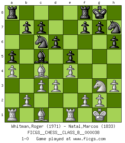 Last move : 1-0 2008 April 22 20:23:55 [Event "FICGS__CHESS__CLASS_B__000038"] [Site "FICGS"] [Date "2008.01.16"] [Round "1"] [White "Whitman,Roger"] [Black "Natal,Marcos"] [Result "1-0"] [WhiteElo "1971"] [BlackElo "1833"] 1.e4 e5 2.Nf3 Nc6 3.Bc4 Bc5 4.O-O d6 5.c3 Nf6 6.d3 Bg4 7.Nbd2 O-O 8.h3 Bxf3 9.Qxf3 a5 10.a4 h6 11.Re1 Nh7 12.Nf1 Qh4 13.Qg3 Qxg3 14.Nxg3 1-0 This chess game has been lost on time (started : 2008.01.16 8:19:29) Giuoco Piano Kingside Castling by player White (move 4) Kingside Castling by player Black (move 7) Player White won this chess game. Follow this game move after move (download)It's just you and your opponent at the board and you're trying to prove something. (Bobby Fischer) Korrekt heißt in Deutschland die Haltung eines Mannes, dessen Benehmen nach dem Urteile seiner Nachbarn seiner Stellung angemessen ist. Um korrekt zu sein, muß man sich der Meinung der anderen anpassen... (Emanuel Lasker) Los asuntos humanos son como una partida de Ajedrez: solo aquellos que no lo toman seriamente, pueden ser llamados buenos jugadores. (Hung Tzu Ch'eng) La solitude du joueur d'Echecs à l'approche du mat est semblable à celle du condamné. (Francis Szpiner) If you know the enemy and know yourself you need not fear the results of a hundred battles. (Sun Tzu)