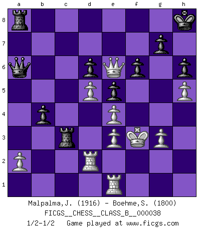 Last move : 1/2-1/2 2008 February 14 16:4:48 [Event "FICGS__CHESS__CLASS_B__000038"] [Site "FICGS"] [Date "2008.01.16"] [Round "1"] [White "Malpalma,Joaquim"] [Black "Boehme,Sebastian"] [Result "1/2-1/2"] [WhiteElo "1916"] [BlackElo "1800"] 1.c4 e5 2.Nc3 Nf6 3.Nf3 Nc6 4.g3 Bb4 5.Nd5 Bc5 6.d3 h6 7.Bh3 O-O 8.e4 d6 9.Bxc8 Rxc8 10.O-O Nxd5 11.cxd5 Nd4 12.Nxd4 Bxd4 13.Be3 Bxe3 14.fxe3 c6 15.dxc6 Rxc6 16.Rf2 Qb6 17.Qf3 f6 18.Rd1 Rfc8 19.R1d2 Rc1+ 20.Kg2 Kf8 21.d4 Re8 22.Rfe2 Qc6 23.Qf5 b5 24.b3 Re7 25.h4 Kg8 26.h5 a5 27.Kh2 b4 28.Kg2 Rc3 29.Kh2 a4 30.d5 Qb5 31.bxa4 Qxa4 32.Kg2 Re8 33.Kf3 Kh8 34.Qg6 Rec8 35.Qf7 Ra8 36.Qe6 Qa6 37.Re1 1/2-1/2 English Opening Kingside Castling by player Black (move 7) Kingside Castling by player White (move 10) This chess game ended in a draw. Follow this game move after move (download)Place the contents of the Chess box in a hat, shake them up vigorously, pour them on the board from a height of two feet, and you get the style of Steinitz. (H. E. Bird) Nicht daß Diemer aus Opportunismus Mitglied der NSDAP geworden wäre. Er war ein Fanatiker, in allem, was er tat. (Hans Ree) Un buen sacrificio es aquel que aunque no sea necesariamente sólido, deja a tu oponente aturdido y confuso. (Rudolph Spielmann) J'ai toujours senti une vague pitié pour l'homme qui ne connaît rien aux échecs, tout comme j'en aurais pour un homme ignorant de l'amour. Les Echecs, comme la musique ou comme l'amour, ont le pouvoir de rendre heureux. (Siegbert Tarrasch) Winning isn't everything... but losing is nothing. (Mednis)