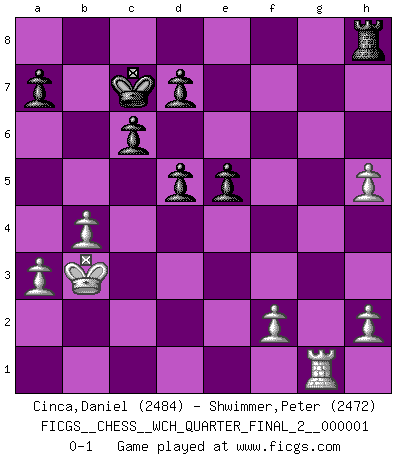 Last move : 0-1 2006 October 12 18:10:9 [Event "FICGS__CHESS__WCH_QUARTER_FINAL_2__000001"] [Site "FICGS"] [Date "2006.07.01"] [Round "7"] [White "Cinca,Daniel"] [Black "Shwimmer,Peter"] [Result "0-1"] [WhiteElo "2484"] [BlackElo "2472"] 1.e4 e5 2.Nf3 Nc6 3.d4 exd4 4.Nxd4 Nf6 5.Nxc6 bxc6 6.e5 Qe7 7.Qe2 Nd5 8.c4 Ba6 9.b3 g5 10.g3 Bg7 11.Bb2 O-O-O 12.Nd2 Nb4 13.Nf3 Rhe8 14.Bh3 h5 15.a3 Nd5 16.Qd2 g4 17.cxd5 Qc5 18.b4 Qxd5 19.Qxd5 cxd5 20.Bf1 Bxf1 21.Rxf1 gxf3 22.O-O-O c6 23.Rd3 Bxe5 24.Rxf3 f6 25.Rf5 h4 26.gxh4 Bxb2+ 27.Kxb2 Re2+ 28.Kb3 Rh8 29.h5 Kc7 30.Rg1 Re5 31.Rxe5 fxe5 0-1 This chess game has been lost on time (started : 2006.07.01 16:47:52) Scotch : Mieses variation Queenside Castling by player Black (move 11) Queenside Castling by player White (move 22) Player Black won this chess game. Follow this game move after move (download)By the beauty of his games, the clarity of his play, and the brilliance of his ideas, Fischer made himself an artist of the same stature as Brahms, Rembrandt, and Shakespeare. (David Levy) Ohne Leiden bildet sich kein Charakter. (Ernst Freiherr von Feuchtersleben) El Ajedrez hace al hombre ser mas sabio y ver mas claro. (Vladimir Putin) Je crois qu'il existe des manières très spécifiques de jouer efficacement contre une machine. Evidemment, nous n'avons aucune chance en technique pure, parce que l'ordinateur calcule de manière parfaite. Mais lorsque nous faisons appel à notre cerveau, en utilisant l'intuition et la compréhension, alors nous restons beaucoup plus forts. (Anatoli Karpov) The best teachers teach from the heart, not from the book. (Author unknown)