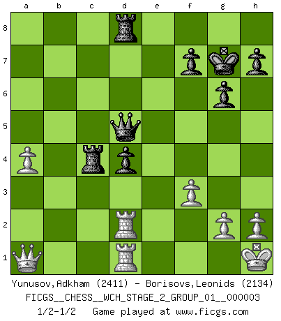 Last move : 1/2-1/2 2008 April 17 12:34:8 [Event "FICGS__CHESS__WCH_STAGE_2_GROUP_01__000003"] [Site "FICGS"] [Date "2008.01.17"] [Round "1"] [White "Yunusov,Adkham"] [Black "Borisovs,Leonids"] [Result "1/2-1/2"] [WhiteElo "2411"] [BlackElo "2134"] 1.d4 Nf6 2.c4 g6 3.Nc3 Bg7 4.e4 d6 5.Nf3 O-O 6.Be2 e5 7.Be3 exd4 8.Nxd4 Re8 9.f3 c6 10.Bf2 d5 11.exd5 cxd5 12.O-O Nc6 13.c5 Bf8 14.Rb1 Bxc5 15.Kh1 Bb6 16.Qd2 Kg7 17.Bb5 Bd7 18.Bxc6 bxc6 19.b4 a5 20.Na4 Bc7 21.Nc5 axb4 22.Rfc1 Bb6 23.Nxd7 Qxd7 24.Nxc6 Bxf2 25.Qxf2 Rac8 26.Nxb4 Rc4 27.a3 Rec8 28.Qb2 Qf5 29.Rd1 d4 30.Rd2 Qc5 31.Rbd1 Nd5 32.Nxd5 Qxd5 33.Qa1 Rd8 34.a4 1/2-1/2 King's Indian : Gligoric-Taimanov system Kingside Castling by player Black (move 5) Kingside Castling by player White (move 12) This chess game ended in a draw. Follow this game move after move (download)Chess makes man wiser and clear-sighted. (Vladimir Putin) Ich habe kein Problem mit Frauen, sondern nur mit dem Niveau ihres Schachspiels (Judith Polgar) La última cosa en que Fischer estaba interesado era en tonterías, siempre y cuando el Ajedrez estuviera involucrado. (Elie Agur) Un millionnaire : 'Monsieur Steinitz ! Vous ne participez aux tournois que pour l'argent, alors que moi je n'y viens que pour l'honneur.' Steinitz : 'Chacun joue pour ce qu'il n'a pas'... Have no fear of perfection - you'll never reach it. (Salvador Dali)
