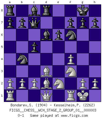 Last move : 0-1 2008 March 7 15:26:11 [Event "FICGS__CHESS__WCH_STAGE_2_GROUP_01__000003"] [Site "FICGS"] [Date "2008.01.17"] [Round "1"] [White "Bondarev,Sergey"] [Black "Kesselheim,Peter"] [Result "0-1"] [WhiteElo "1904"] [BlackElo "2262"] 1.e4 e6 2.d3 c5 3.f4 Nc6 4.Nf3 d5 5.Nbd2 Nf6 6.Be2 Qc7 7.Nf1 dxe4 8.dxe4 Nxe4 9.Bd3 Nf6 10.Ng3 Bd6 11.Ne2 O-O 12.O-O Rd8 13.Bd2 Nb4 0-1 This chess game has been lost on time (started : 2008.01.17 3:43:37) French : King's Indian attack Kingside Castling by player Black (move 11) Kingside Castling by player White (move 12) Player Black won this chess game. Follow this game move after move (download)First-class players lose to second class players because second-class players sometimes play a first-class game. (Tarrasch) Ich hatte meine größten Erfolge, als ich 47 Jahre alt war. Kasparow war noch nicht mal 42 und hat das Schach schon im Stich gelassen. (Viktor Kortschnoi) Los tropiezos estan todos ahí en el tablero, esperando que se cometan. (Savielly Tartakover) Nous vivons dans un monde échiquéen : chaque jour qui passe est un défi à relever. (Philosophe Sasha) Art is the triumph over chaos. (John Cheever)