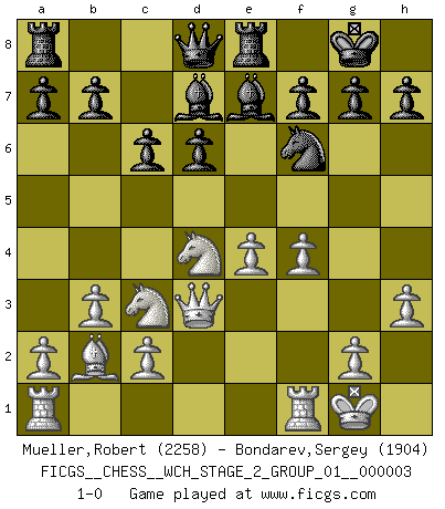 Last move : 1-0 2008 March 13 16:3:17 [Event "FICGS__CHESS__WCH_STAGE_2_GROUP_01__000003"] [Site "FICGS"] [Date "2008.01.17"] [Round "1"] [White "Mueller,Robert"] [Black "Bondarev,Sergey"] [Result "1-0"] [WhiteElo "2258"] [BlackElo "1904"] 1.e4 e5 2.Nf3 Nc6 3.Bb5 Nf6 4.O-O d6 5.d4 Bd7 6.Nc3 Be7 7.Bxc6 Bxc6 8.Qd3 exd4 9.Nxd4 Bd7 10.b3 O-O 11.Bb2 Re8 12.f4 c6 13.h3 1-0 This chess game has been lost on time (started : 2008.01.17 3:43:37) Ruy Lopez : Closed Berlin defense, Showalter variation Kingside Castling by player White (move 4) Kingside Castling by player Black (move 10) Player White won this chess game. Follow this game move after move (download)Chess problems demand from the composer the same virtues that characterize all worthwhile art: originality, invention, conciseness, harmony, complexity, and splendid insincerity. (Vladimir Nabokov) Jeder weiß, dass Gasprom Putins persönliches Machtinstrument ist. Die Firma wird vom Kreml aus geleitet und wird schon deshalb nie transparent sein. (Garry Kasparov) Las Aperturas te enseñan aperturas. ¡Los Finales te enseñan Ajedrez!. (Stephan Gerzadowicz) Celui qui prend des risques peut perdre, celui qui n'en prend pas perd toujours. (Xavier Tartacover) However beautiful the strategy, you should occasionally look at the results. (Winston Churchill)
