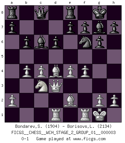 Last move : 0-1 2008 March 8 3:40:1 [Event "FICGS__CHESS__WCH_STAGE_2_GROUP_01__000003"] [Site "FICGS"] [Date "2008.01.17"] [Round "1"] [White "Bondarev,Sergey"] [Black "Borisovs,Leonids"] [Result "0-1"] [WhiteElo "1904"] [BlackElo "2134"] 1.e4 c5 2.Nf3 Nc6 3.c4 g6 4.d4 cxd4 5.Nxd4 Bg7 6.Be3 d6 7.Be2 Nf6 8.Nc3 O-O 9.O-O Nxd4 10.Bxd4 Bd7 11.Qd3 Bc6 12.b4 b6 13.f4 Re8 14.Rad1 Qc8 0-1 This chess game has been lost on time (started : 2008.01.17 3:43:37) Sicilian defense Kingside Castling by player Black (move 8) Kingside Castling by player White (move 9) Player Black won this chess game. Follow this game move after move (download)Castle early and often. (Rob Sillars) Ivan Sokolov treibt mich als Beifahrer an mit go Loeky go - . (Loek van Wely) Uno por uno, yo los acribillé, mi superioridad muy pronto se volvio aparente. (Jose Capablanca) 'L'échange des dames est un coup dur pour les deux adversaires...' Un journaliste lors d'une partie du match Spassky-Fischer The obstacle is the path. (Zen proverb)