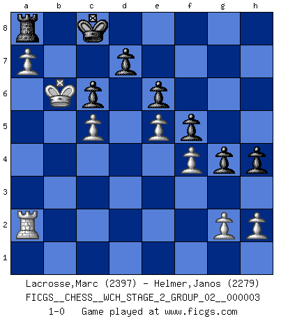 Last move : 1-0 2008 May 2 16:20:52 [Event "FICGS__CHESS__WCH_STAGE_2_GROUP_02__000003"] [Site "FICGS"] [Date "2008.01.17"] [Round "1"] [White "Lacrosse,Marc"] [Black "Helmer,Janos"] [Result "1-0"] [WhiteElo "2397"] [BlackElo "2279"] 1.e4 c5 2.Nf3 Nc6 3.Nc3 e6 4.Bb5 Nge7 5.d4 cxd4 6.Nxd4 Nxd4 7.Qxd4 Nc6 8.Qd3 Bc5 9.Bf4 O-O 10.O-O f5 11.Bd6 Bxd6 12.Qxd6 Qb6 13.e5 a6 14.Bxc6 Qxc6 15.Qxc6 bxc6 16.f4 Rb8 17.Na4 Kf7 18.b3 h6 19.c4 g5 20.Nc5 Ke7 21.Rad1 Ra8 22.Rd3 Rh8 23.Rfd1 Ra7 24.Rg3 g4 25.b4 Rd8 26.Rd6 Rg8 27.Kf2 h5 28.Ra3 h4 29.Ke3 Rg6 30.Kd4 Rc7 31.Ra5 Rg8 32.Nxa6 Bxa6 33.Rxa6 Rb8 34.Kc5 Rcb7 35.a3 Rc8 36.a4 Rcb8 37.a5 Rxb4 38.Ra7 R4b7 39.Rxb7 Rxb7 40.Rd2 Kd8 41.a6 Rb1 42.Ra2 Rb8 43.a7 Ra8 44.Kb6 Kc8 45.c5 1-0 Sicilian defense Kingside Castling by player Black (move 9) Kingside Castling by player White (move 10) Player White won this chess game. Follow this game move after move (download)To avoid losing a piece, many a person has lost the game. (Savielly Tartakover) Wer wird heute Abend ihr Gegner sein? -- Heute Abend spiele ich gegen die schwarzen Steine. (Akiba Rubinstein) En el Ajedrez, tal como en la vida, las bendiciones de hoy pueden ser el veneno del mañana. (Assaic) Il n'y a plus de joueurs du niveau de Jacob Murray dont la seule quête est le beau jeu, le plaisir de voir les pièces construire quelque chose. Sur 10 idées à la minute, 9 seront sans intérêt, la dernière s'avèrera géniale. (Christian Bauer) A generalist learns less and less about more and more until he knows nothing about everything. (Author unknown)