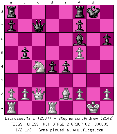 Last move : 1/2-1/2 2008 February 24 21:52:14 [Event "FICGS__CHESS__WCH_STAGE_2_GROUP_02__000003"] [Site "FICGS"] [Date "2008.01.17"] [Round "1"] [White "Lacrosse,Marc"] [Black "Stephenson,Andrew"] [Result "1/2-1/2"] [WhiteElo "2397"] [BlackElo "2142"] 1.e4 c5 2.Nf3 d6 3.c3 Nf6 4.Be2 Bd7 5.Qc2 Qc7 6.O-O g6 7.d4 cxd4 8.Nxd4 Nc6 9.Be3 d5 10.Nb5 Qb8 11.Rd1 dxe4 12.Nd2 Bf5 13.Nd4 Bg7 14.Nxf5 gxf5 15.g3 O-O 16.Bf4 e5 17.Bg5 Qc7 18.Nc4 h6 19.Bxf6 Bxf6 20.g4 Nd4 21.cxd4 exd4 22.gxf5 b5 1/2-1/2 Sicilian Kingside Castling by player White (move 6) Kingside Castling by player Black (move 15) This chess game ended in a draw. Follow this game move after move (download)Chess mastery essentially consists of analyzing Chess positions accurately. (Mikhail Botvinnik) Das Schach ist nichts für kleine Geister, es beansprucht einen vollen Mann, der sich nicht sklavisch an das Überlieferte hält, sondern selbständig die Tiefen des Spiels zu ergründen sucht. (Wilhelm Steinitz) No solamente yo pronostico su triunfo sobre Botvinnik, sino que me adelanto y digo que probablemente Fischer es el jugador de Ajedrez mas grande que haya existido. (John Collins) Je menace de comprendre la position. (Anonyme) Only sick music makes money today. (Friedrich Nietzsche)