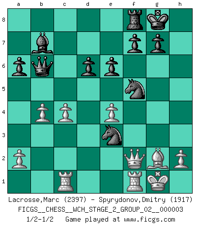 Last move : 1/2-1/2 2008 March 23 10:49:25 [Event "FICGS__CHESS__WCH_STAGE_2_GROUP_02__000003"] [Site "FICGS"] [Date "2008.01.17"] [Round "1"] [White "Lacrosse,Marc"] [Black "Spyrydonov,Dmitry"] [Result "1/2-1/2"] [WhiteElo "2397"] [BlackElo "1917"] 1.e4 c5 2.Nf3 d6 3.c3 Nf6 4.Be2 Nbd7 5.Qc2 Qc7 6.O-O b6 7.c4 Bb7 8.Nc3 e6 9.d4 cxd4 10.Nxd4 a6 11.Be3 Be7 12.f4 O-O 13.g4 Nc5 14.Bf3 h6 15.b4 Ncd7 16.Rac1 Rac8 17.g5 hxg5 18.fxg5 Ne8 19.Bg4 Ne5 20.Bh3 Qd7 21.g6 Nxg6 22.Nd5 Nf6 23.Nxb6 Qe8 24.Nxc8 Qxc8 25.Bg5 Qd8 26.Bg2 Qb6 27.Be3 Ng4 28.Nf5 Nxe3 29.Nxe7+ Nxe7 30.Qf2 N7f5 1/2-1/2 Sicilian Kingside Castling by player White (move 6) Kingside Castling by player Black (move 12) This chess game ended in a draw. Follow this game move after move (download)Everything is in a state of flux, and this includes the world of Chess. (Mikhail Botvinnik) Die jungen Leute sollen verstehen, dass sie noch etwas von mir lernen können und müssen. (Viktor Kortschnoi) Yo adoro todas la posiciones. Denme una partida posicional difícil, y la jugaré. Pero posiciones totalmente ganadas, no las tolero. (Hein Donner) Le joueur d'Echecs qui veut atteindre le top est obligé de développer son propre credo créatif. Alexeï Stepanovicth Souétine. Il est facile d'écrire des livres ! Ce qui est difficile, c'est de jouer ! (Alexeï Stepanovicth Souétine) Whatever you do, don't be bored. This is absolutely the most exciting time we could have possibly hoped to be alive. And things are just starting. (From movie Waking life)