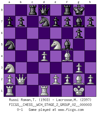 Last move : 0-1 2008 April 5 16:23:16 [Event "FICGS__CHESS__WCH_STAGE_2_GROUP_02__000003"] [Site "FICGS"] [Date "2008.01.17"] [Round "1"] [White "Russi Roman,Tano-Urayoan"] [Black "Lacrosse,Marc"] [Result "0-1"] [WhiteElo "1903"] [BlackElo "2397"] 1.c4 Nf6 2.g3 g6 3.Bg2 Bg7 4.Nf3 O-O 5.O-O d5 6.d4 dxc4 7.Na3 c3 8.bxc3 c5 9.Qb3 Nc6 10.Rd1 Na5 11.Qb2 Bf5 12.Ne5 Rc8 13.Bf4 cxd4 14.cxd4 Nd7 0-1 English, 1...Nf6 (Anglo-Indian defense) Kingside Castling by player Black (move 4) Kingside Castling by player White (move 5) Player Black won this chess game. Follow this game move after move (download)I give 98 percent of my mental energy to Chess. Others give only 2 percent. (Bobby Fischer) Schach ist Leben. (Robert James Fischer) El arma más poderosa en el Ajedrez, es tener la próxima movida. (David Bronstein) Plusieurs personnes se sont demandées comment Tal faisait pour gagner... En fait, c'est très simple ! Il met ses pièces au centre de l'échiquier et les sacrifie quelque part ! (David Bronstein) Computer Science is no more about computers than astronomy is about telescopes. (Edsger W. Dijkstra)