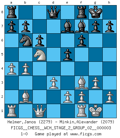 Last move : 1-0 2008 April 7 19:8:31 [Event "FICGS__CHESS__WCH_STAGE_2_GROUP_02__000003"] [Site "FICGS"] [Date "2008.01.17"] [Round "1"] [White "Helmer,Janos"] [Black "Minkin,Alexander"] [Result "1-0"] [WhiteElo "2279"] [BlackElo "2079"] 1.c4 e5 2.Nc3 Nf6 3.g3 d5 4.cxd5 Nxd5 5.Bg2 Nb6 6.Nf3 Nc6 7.O-O Be7 8.d3 O-O 9.a3 Be6 10.b4 Nd4 11.Bb2 Bb3 12.Qc1 Nxf3+ 13.Bxf3 c6 14.Ne4 f6 15.a4 Bf7 16.Nc5 1-0 This chess game has been lost on time (started : 2008.01.17 3:48:54) English : Bremen, reverse Dragon Kingside Castling by player White (move 7) Kingside Castling by player Black (move 8) Player White won this chess game. Follow this game move after move (download)I prefer to lose a really good game than to win a bad one. (David Levy) Schach ist ein schwarz-weisser Dschungel. (Garry Kasparov) ¿Cual es el objetivo de jugar una apertura de gambito?... Para adquirir una reputación de ser un jugador apuesto a costo de perder el juego. (Siegbert Tarrasch) Nous vivons dans un monde échiquéen : chaque jour qui passe est un défi à relever. (Philosophe Sasha) Don't be discouraged. It's often the last key in the bunch that opens the lock. (Author unknown)