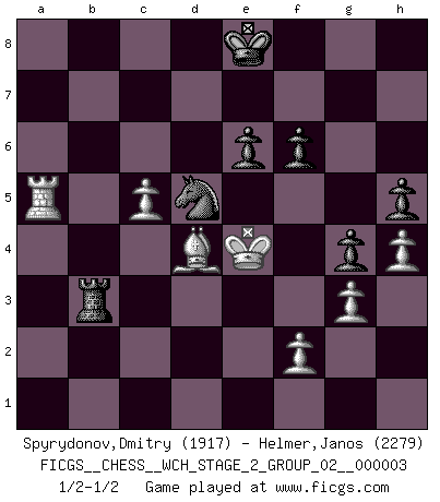 Last move : 1/2-1/2 2008 June 19 20:10:7 [Event "FICGS__CHESS__WCH_STAGE_2_GROUP_02__000003"] [Site "FICGS"] [Date "2008.01.17"] [Round "1"] [White "Spyrydonov,Dmitry"] [Black "Helmer,Janos"] [Result "1/2-1/2"] [WhiteElo "1917"] [BlackElo "2279"] 1.Nf3 Nf6 2.c4 c5 3.Nc3 e6 4.g3 b6 5.Bg2 Bb7 6.O-O Be7 7.Re1 O-O 8.e4 d6 9.d4 cxd4 10.Nxd4 Qc8 11.b3 Nbd7 12.Bb2 a6 13.Re2 Qc7 14.Qe1 Rfe8 15.Rd1 Bf8 16.h3 Rac8 17.Qd2 Ne5 18.Qe3 Nc6 19.Nxc6 Bxc6 20.e5 dxe5 21.Qxe5 Qb7 22.Bxc6 Qxc6 23.Red2 Bc5 24.Qe2 b5 25.cxb5 axb5 26.Rc1 Rb8 27.Qe5 Bb4 28.a3 Bxc3 29.Rxc3 Qe4 30.Rc1 Qxe5 31.Bxe5 Ra8 32.Bb2 Rec8 33.Rdc2 Rd8 34.Kf1 Kf8 35.Ke2 Nd5 36.Rc5 Rab8 37.Rc6 h5 38.R1c5 g5 39.Ra6 Rbc8 40.b4 Ke8 41.Ra5 Rxc5 42.bxc5 b4 43.axb4 Nxb4 44.Ra4 Nd5 45.Ra5 g4 46.h4 f6 47.Kd3 Rb8 48.Bd4 Rb3+ 49.Ke4 1/2-1/2 Reti Opening Kingside Castling by player White (move 6) Kingside Castling by player Black (move 7) This chess game ended in a draw. Follow this game move after move (download)A chess genius has died; a loss for humanity. (Viktor Kortchnoi, about Bobby Fischer's death) Meine Liebe ist Schach, Schach, Schach. Ich muss jeden Tag Schach spielen, deshalb fühle ich mich so stark. (Miguel Najdorf) No soy una persona materialista y por eso, no resiento la falta o pérdida del dinero. La ausencia de cosas mundanas carece de importancia. Ya que el Ajedrez es una forma en la que puedo ser tan materialista como yo desee sin tener la necesidad de vender mi alma. (Jamie Walter Adams) Pour se monter efficace, un Cavalier a besoin d'avant-postes ! Les Cavaliers font les meilleurs bloqueurs de pions passés. Once you start thinking you have nothing left to learn, you have everything to learn. (Steve Badget)