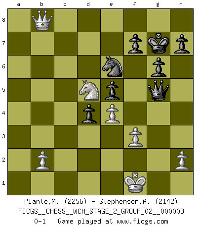 Last move : 0-1 2008 May 16 22:6:16 [Event "FICGS__CHESS__WCH_STAGE_2_GROUP_02__000003"] [Site "FICGS"] [Date "2008.01.17"] [Round "1"] [White "Plante,Marc-Eric"] [Black "Stephenson,Andrew"] [Result "0-1"] [WhiteElo "2256"] [BlackElo "2142"] 1.e4 c5 2.Nf3 d6 3.d4 cxd4 4.Nxd4 Nf6 5.Nc3 a6 6.Be3 e5 7.Nb3 Be6 8.f3 Be7 9.Qd2 O-O 10.O-O-O Nbd7 11.g4 b5 12.g5 b4 13.Ne2 Ne8 14.Ng3 a5 15.Kb1 a4 16.Nc1 b3 17.cxb3 axb3 18.Nxb3 Rxa2 19.Kxa2 Qa8+ 20.Kb1 Bxb3 21.Bd3 d5 22.Nf5 Bc5 23.Bxc5 Nxc5 24.Qc3 Qa2+ 25.Kc1 Nxd3+ 26.Qxd3 d4 27.Qb1 Qa4 28.Kd2 Nc7 29.Ke2 Bxd1+ 30.Rxd1 Ne6 31.Qc1 Rb8 32.Kf2 g6 33.Ne7+ Kg7 34.Nd5 Rc8 35.Qxc8 Qxd1 36.Qb8 Qd2+ 37.Kf1 Qxg5 0-1 This chess game has been lost on time (started : 2008.01.17 3:48:54) Sicilian : Najdorf, Byrne (English) attack Kingside Castling by player Black (move 9) Queenside Castling by player White (move 10) Player Black won this chess game. Follow this game move after move (download)During a Chess competition a Chessmaster should be a combination of a beast of prey and a monk. (Alexander Alekhine) Es ist peinlich, dass ich nie Weltmeister wurde. Es wäre leicht, Leonid Breschnjew als Ursache vorzuschieben, dessen Apparat den Vorzeigekommunisten Anatoli Karpow in allem unterstützte. Aber Garri Kasparow zum Beispiel, der ebenfalls von den Sowjets unerwünscht war, hat trotz der Widerstände den WM-Titel erobert. (Viktor Kortschnoi) El Ajedrez es imaginación. (David Bronstein) Seul un grand joueur sait à quel point il joue faiblement. (Xavier Tartacover) Being number two sucks. (Andre Agassi)