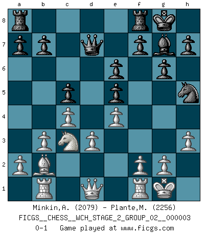 Last move : 0-1 2008 April 3 6:52:25 [Event "FICGS__CHESS__WCH_STAGE_2_GROUP_02__000003"] [Site "FICGS"] [Date "2008.01.17"] [Round "1"] [White "Minkin,Alexander"] [Black "Plante,Marc-Eric"] [Result "0-1"] [WhiteElo "2079"] [BlackElo "2256"] 1.e4 c5 2.b3 d6 3.Bb2 Nf6 4.Bb5+ Bd7 5.Bxd7+ Qxd7 6.d3 Nc6 7.Nf3 g6 8.O-O Bg7 9.c4 O-O 10.h3 e6 11.Nc3 Nh5 12.Rb1 Ne5 13.Nxe5 dxe5 0-1 This chess game has been lost on time (started : 2008.01.17 3:48:54) Sicilian defense Kingside Castling by player White (move 8) Kingside Castling by player Black (move 9) Player Black won this chess game. Follow this game move after move (download)Only the player with the initiative has the right to attack. (Wilhelm Steinitz) Es ist im Leben wie im Schachspiel. Wir entwerfen einen Plan, dieser bleibt jedoch bedingt durch das, was im Schachspiel dem Gegner, im Leben dem Schicksal zu tun belieben wird. (Arthur Schopenhauer) No es suficiente ser un buen jugador, se debe también de jugar bién. (Siegbert Tarrasch) Lorsque vous vous retrouvez devant une position atroce, ne tendez pas un ultime piège dérisoire avec l'intention d'abandonner si l'adversaire le déjoue ! Faites-vous plutôt un devoir de résister comme si votre vie en dépendait. Jouez le coup qui vous déplairait au centuple si vous étiez dans la peau de votre tortionnaire ! Even the best needles are not sharp at both ends. (Chinese proverb)