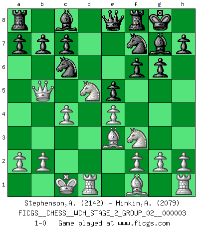 Last move : 1-0 2008 March 28 5:16:33 [Event "FICGS__CHESS__WCH_STAGE_2_GROUP_02__000003"] [Site "FICGS"] [Date "2008.01.17"] [Round "1"] [White "Stephenson,Andrew"] [Black "Minkin,Alexander"] [Result "1-0"] [WhiteElo "2142"] [BlackElo "2079"] 1.d4 g6 2.c4 Bg7 3.Nc3 d6 4.e4 e5 5.Nf3 Nc6 6.Bg5 f6 7.Be3 Nh6 8.dxe5 dxe5 9.Qd5 Nf7 10.O-O-O O-O 11.Qb5 Qe8 12.Nd5 1-0 This chess game has been lost on time (started : 2008.01.17 3:48:54) Modern defense Queenside Castling by player White (move 10) Kingside Castling by player Black (move 10) Player White won this chess game. Follow this game move after move (download)When I have White, I win because I am white; When I have Black, I win because I am Bogolyubov. (Bogolyubov) Schach ist Kampf, hauptsächlich jedoch gegen die eigenen Fehler. (Savielly Grigorievitsch Tartakower) El jugador táctico sabe que hacer cuando hay algo que hacer; mientras que el estratega sabe que hacer cuando no hay nada que hacer. (Gerald Abrahams) 'L'échange des dames est un coup dur pour les deux adversaires...' Un journaliste lors d'une partie du match Spassky-Fischer Follow your passion, and success will follow you. (Arthur Buddhold)