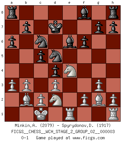 Last move : 0-1 2008 March 5 15:46:54 [Event "FICGS__CHESS__WCH_STAGE_2_GROUP_02__000003"] [Site "FICGS"] [Date "2008.01.17"] [Round "1"] [White "Minkin,Alexander"] [Black "Spyrydonov,Dmitry"] [Result "0-1"] [WhiteElo "2079"] [BlackElo "1917"] 1.e4 c5 2.b3 a6 3.Bb2 e6 4.Nf3 Nc6 5.g3 d5 6.exd5 exd5 7.Qe2+ Qe7 8.Qxe7+ Ngxe7 9.Nc3 Nb4 10.O-O-O Bf5 11.d3 d4 12.Ne4 Nec6 13.Re1 Kd7 14.a3 Nd5 15.Bg2 f6 16.Nfd2 Be6 0-1 Sicilian defense Queenside Castling by player White (move 10) Player Black won this chess game. Follow this game move after move (download)No one ever won a game by resigning. (Unknown) Ich bin Weltmeister und muß mit niemandem irgend etwas diskutieren. (Viswanathan Anand) No es tiempo de jugar al Ajedrez cuando la casa esta en llamas. (Proverbio Italiano) Les sacrifices démontrent seulement que quelqu'un a gaffé. (Savielly Tartacover) Rules and bones are meant to be broken. (Anonymous)