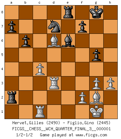 Last move : 1/2-1/2 2006 August 21 18:23:4 [Event "FICGS__CHESS__WCH_QUARTER_FINAL_3__000001"] [Site "FICGS"] [Date "2006.07.01"] [Round "3"] [White "Hervet,Gilles"] [Black "Figlio,Gino"] [Result "1/2-1/2"] [WhiteElo "2490"] [BlackElo "2445"] 1.c4 e5 2.Nc3 Nf6 3.Nf3 Nc6 4.g3 Bb4 5.Bg2 O-O 6.O-O Bxc3 7.bxc3 Re8 8.d3 e4 9.Nd4 exd3 10.exd3 h6 11.Rb1 Nxd4 12.cxd4 d5 13.Bf4 c6 14.Be5 Ng4 15.Bf4 Nf6 16.Qd2 b6 17.h3 Be6 18.Rbc1 Rc8 19.Rfe1 c5 20.Re5 cxd4 21.Bxh6 dxc4 22.Qg5 g6 23.dxc4 Nd7 24.Re4 Qxg5 25.Bxg5 d3 26.Rd4 Rc5 27.Bf4 g5 28.Bd6 Ra5 29.Rxd3 Rxa2 1/2-1/2 Comment by player 2 : Gino Figlio : Equal game from the start English Opening Kingside Castling by player Black (move 5) Kingside Castling by player White (move 6) This chess game ended in a draw. Follow this game move after move (download)Chess is life. (Bobby Fischer) Ein Kibitz ist einer, der deinem Gegner gute Ratschläge gibt. (Andrew Soltis) Los Peones son nacidos libres, y aún así, se encuentran encadenados por todos lados. (Rick Kennedy) Mon pion favori sur ma case favorite ! Bronstein en parlant d'un coup de pion en h5 quand il avait les Noirs. Looking at the proliferation of personal web pages on the Net, it looks like very soon everyone on Earth will have 15 megabytes of fame. (M.G. Sriram)