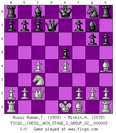 Last move : 1-0 2008 April 8 19:16:11 [Event "FICGS__CHESS__WCH_STAGE_2_GROUP_02__000003"] [Site "FICGS"] [Date "2008.01.17"] [Round "1"] [White "Russi Roman,Tano-Urayoan"] [Black "Minkin,Alexander"] [Result "1-0"] [WhiteElo "1903"] [BlackElo "2079"] 1.e4 g6 2.c4 Bg7 3.d4 d6 4.Nc3 e5 5.Nf3 Nc6 6.Bg5 Qd7 7.dxe5 h6 8.Bh4 Nxe5 9.Nxe5 dxe5 10.Qc2 1-0 This chess game has been lost on time (started : 2008.01.17 3:48:54) Robatsch (Modern) defense Player White won this chess game. Follow this game move after move (download)The way he plays Chess demonstrates a man's whole nature. (Stanley Ellin) Offener Brief an US-Präsident Bush anlässlich der Verhaftung Bobby Fishers: Verhaften Sie mich. Stecken Sie mich in dieselbe Zelle wie Bobby Fisher und geben Sie uns ein Schachspiel mit. (Boris Vassilievich Spassky) Estaba muy claro de que el punto vulnerable del Gran Maestro Americano (Bobby Fischer) radicaba en las posiciones de doble filo, colgantes, irracionales, donde el siempre falló en encontrar un triunfo aún en una posición de clara victoria. (Efim Geller) On n'a jamais que l'âge auquel on a commence à jouer aux échecs car après on cesse de vieillir. (Capablanca) The message for business people contemplating their place in the cyberspace is simple and direct: get linked or get lost. (Vic Sussman and Kenan Pollack)