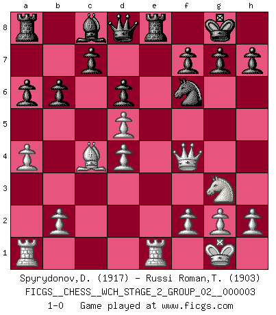 Last move : 1-0 2008 April 12 18:44:54 [Event "FICGS__CHESS__WCH_STAGE_2_GROUP_02__000003"] [Site "FICGS"] [Date "2008.01.17"] [Round "1"] [White "Spyrydonov,Dmitry"] [Black "Russi Roman,Tano-Urayoan"] [Result "1-0"] [WhiteElo "1917"] [BlackElo "1903"] 1.c4 e5 2.Nc3 Bb4 3.Nd5 Bc5 4.e3 Nf6 5.d4 Nxd5 6.cxd5 exd4 7.exd4 Bb4+ 8.Bd2 Bxd2+ 9.Qxd2 O-O 10.Bc4 d6 11.Ne2 Nd7 12.O-O Nf6 13.Rfe1 a6 14.a4 b6 15.Ng3 Re8 16.Qf4 1-0 English, Kramnik-Shirov counterattack Kingside Castling by player Black (move 9) Kingside Castling by player White (move 12) Player White won this chess game. Follow this game move after move (download)Look at Garry Kasparov. After he loses, invariably he wins the next game. He just kills the next guy. That's something that we have to learn to be able to do. (Maurice Ashley) Du weisst es gibt ein Problem mit Computern und Fernschach, wenn jeder eine Rating von 2450 hat. (John Christen Knudsen) Aquel que teme a un Peón de Reina aislado, debería de retirarse del Ajedrez. (Siegbert Tarrasch) Mais l'homme est une créature légère et illogique : semblable au joueur d'échecs, il n'aime que le processus du but à atteindre, non le but lui-même. (Dostoïevsky) Hold em is to stud what chess is to checkers. (Johnny Moss)
