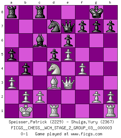 Last move : 0-1 2008 April 25 20:37:38 [Event "FICGS__CHESS__WCH_STAGE_2_GROUP_03__000003"] [Site "FICGS"] [Date "2008.01.17"] [Round "1"] [White "Speisser,Patrick"] [Black "Shulga,Yury"] [Result "0-1"] [WhiteElo "2229"] [BlackElo "2367"] 1.e4 e6 2.d4 d5 3.Nc3 Nf6 4.e5 Nfd7 5.f4 c5 6.Nf3 Nc6 7.Be3 cxd4 8.Nxd4 Bc5 9.Qd2 a6 10.O-O-O O-O 11.a3 Nxd4 12.Bxd4 b5 13.Qe3 Bxd4 14.Qxd4 Qe7 15.Kb1 Bb7 16.Bd3 Bc6 17.Ne2 a5 18.Qe3 b4 19.Nd4 Rfc8 0-1 This chess game has been lost on time (started : 2008.01.17 3:51:54) French : Steinitz, Boleslavsky variation Queenside Castling by player White (move 10) Kingside Castling by player Black (move 10) Player Black won this chess game. Follow this game move after move (download)In life, as in Chess, one's own Pawns block one's way. A man's very wealth, ease, leisure, children, books, which should help him to win, more often checkmate him. (Charles Buxton) Unter Putin wird alles Geld aus Russland wie von einem Staubsauger nach Moskau umgeleitet, das ist wie ein schwarzes Loch. (Garry Kasparov) El Ajedrez expande y enriquece tu mente. (Saudin Robovic) La vie est comme un jeu d'échecs : nous esquissons un plan, mais celui-ci est tributaire de ce que daignent faire l'adversaire aux échecs et le destin dans la vie. (Arthur Schopenhauer) A person who never made a mistake never tried anything new. (Albert Einstein)