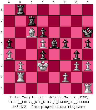 Last move : 1/2-1/2 2008 June 29 3:4:36 [Event "FICGS__CHESS__WCH_STAGE_2_GROUP_03__000003"] [Site "FICGS"] [Date "2008.01.17"] [Round "1"] [White "Shulga,Yury"] [Black "Miranda,Marcus"] [Result "1/2-1/2"] [WhiteElo "2367"] [BlackElo "1932"] 1.e4 c5 2.Nf3 d6 3.d4 cxd4 4.Nxd4 Nf6 5.Nc3 a6 6.Be3 e6 7.Bd3 b5 8.a4 b4 9.Na2 e5 10.Nf3 Nc6 11.O-O Be7 12.c3 bxc3 13.Nxc3 O-O 14.Qe2 Qc7 15.Nd2 Qb7 16.Nc4 Be6 17.Nb6 Nd4 18.Bxd4 exd4 19.Ncd5 Bxd5 20.Nxd5 Nxd5 21.exd5 Bf6 22.Rfe1 g6 23.Rab1 a5 24.Qf3 Kg7 25.Bb5 Rac8 26.Bc6 Qb4 27.Rec1 Rc7 28.g3 Rb8 29.b3 Qd2 30.Qd1 Qxd1+ 31.Rxd1 g5 32.h3 Be5 33.Kf1 f5 34.Ke2 g4 35.Kd3 h5 36.Rh1 Kh6 37.Rb2 1/2-1/2 Sicilian : Najdorf, Byrne (English) attack Kingside Castling by player White (move 11) Kingside Castling by player Black (move 13) This chess game ended in a draw. Follow this game move after move (download)The passion for playing Chess is one of the most unaccountable in the world. (H.G. Wells) Frage: Was machen Sie mit den Preisen? Anwort: Ich habe Angst, dass meine Freundin davon neue Kleider kauft. (Loek van Wely) Bobby es el jugador de Ajedrez mas fino que este país jamás haya producido. Su memoria para las movidas, su brillantez en soñar combinaciones y su feróz determinación por la victoria son algo extraño. (John Collins) Les erreurs sont comme les malheurs, elles n'arrivent jamais seules. (Siegbert Tarrasch) Computers are like Old Testament gods; lots of rules and no mercy. (Joseph Campbell)