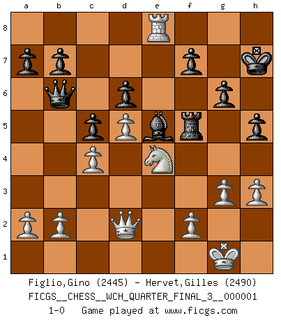 Last move : 1-0 2006 September 2 22:59:42 [Event "FICGS__CHESS__WCH_QUARTER_FINAL_3__000001"] [Site "FICGS"] [Date "2006.07.01"] [Round "4"] [White "Figlio,Gino"] [Black "Hervet,Gilles"] [Result "1-0"] [WhiteElo "2445"] [BlackElo "2490"] 1.d4 Nf6 2.c4 c5 3.d5 g6 4.Nc3 Bg7 5.e4 O-O 6.Bd3 d6 7.h3 e6 8.Nf3 exd5 9.exd5 Re8 10.Be3 Nh5 11.O-O Nd7 12.Qd2 Ne5 13.Be2 Bd7 14.Rae1 Nxf3+ 15.Bxf3 Nf6 16.Bg5 Qb6 17.Qf4 Rxe1 18.Rxe1 Re8 19.Rf1 Re5 20.Bxf6 Rf5 21.Qd2 Rxf6 22.Bg4 Bf5 23.Re1 h5 24.Bxf5 Rxf5 25.Re8+ Kh7 26.Ne4 Be5 27.g3 1-0 Comment by player 1 : Gino Figlio : After 26.Ne4 white is better despite the black bishop and its big b2-h8 diagonal Benoni defense Kingside Castling by player Black (move 5) Kingside Castling by player White (move 11) Player White won this chess game. Follow this game move after move (download)A good sacrifice is one that is not necessarily sound but leaves your opponent dazed and confused. (Rudolph Spielmann) Jeder Fehler erscheint unglaublich dumm, wenn andre ihn begehen. (Georg Christoph Lichtenberg) El Ajedrez es un regaderazo frío para la mente. (Sir John Simon) Tous ces prétendus hommes politiques sont les pions, les Cavaliers, les Tours ou les Fous d'une partie d'échecs qui se jouera tant qu'un hasard ne renversera pas l'échiquier. (Honoré de Balzac) I just play for fun. (Anna Kournikova)