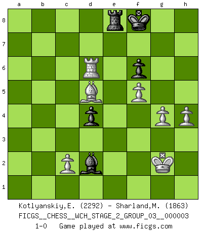 Last move : 1-0 2008 May 20 23:47:57 [Event "FICGS__CHESS__WCH_STAGE_2_GROUP_03__000003"] [Site "FICGS"] [Date "2008.01.17"] [Round "1"] [White "Kotlyanskiy,Edward"] [Black "Sharland,Michael"] [Result "1-0"] [WhiteElo "2292"] [BlackElo "1863"] 1.e4 c5 2.Nf3 d6 3.d4 cxd4 4.Nxd4 Nf6 5.Nc3 a6 6.Bg5 Nbd7 7.f4 Qb6 8.Qd2 Qxb2 9.Rb1 Qa3 10.Bxf6 gxf6 11.Nd5 Kd8 12.Be2 e6 13.Rb3 Qc5 14.Rc3 Qa7 15.Nc7 Rb8 16.Nxa6 e5 17.Nxb8 exd4 18.Rxc8+ Kxc8 19.Nxd7 Kxd7 20.Bc4 Bg7 21.Qd3 Rc8 22.O-O Ke8 23.e5 Qc5 24.exf6 Bxf6 25.Qe4+ Kf8 26.Bd3 Ra8 27.Qxh7 Rxa2 28.Qh6+ Bg7 29.Qh4 Ra8 30.f5 f6 31.Rb1 Re8 32.Rxb7 Qe5 33.h3 Qe3+ 34.Kh1 Qe1+ 35.Qxe1 Rxe1+ 36.Kh2 Bh6 37.g3 Bd2 38.Rb6 Ke7 39.h4 d5 40.Kg2 Re5 41.Rb8 Kf7 42.Rd8 Ke7 43.Ra8 Kf7 44.Ra7+ Re7 45.Ra4 Be3 46.Ra6 Bd2 47.g4 Re5 48.Ra4 Be3 49.Be2 Kg7 50.Bf3 Kf8 51.Ra8+ Kf7 52.Ra7+ Kf8 53.Rd7 Bd2 54.Bxd5 Re7 55.Rd8+ Re8 56.Rd6 1-0 Sicilian : Najdorf, 6.Bg5 Kingside Castling by player White (move 22) Player White won this chess game. Follow this game move after move (download)The blunders are all there on the board, waiting to be made. (Savielly Tartakover) Ein Teil des Fehlers ist immer korrekt. (Savielly Grigorievitsch Tartakower) Yo no creo en la psicología. Yo creo en las buenas movidas. (Bobby Fischer) Le profane ne songe pas à la somme de jouissance dont il se prive, qui méconnaît ce jeu aux ressources aussi variées que passionnantes. (Jean-Marie Jeanton-Lamarche) Before all elsed, be armed. (Niccolo Machiavelli)