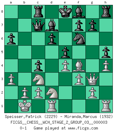 Last move : 0-1 2008 April 24 20:28:21 [Event "FICGS__CHESS__WCH_STAGE_2_GROUP_03__000003"] [Site "FICGS"] [Date "2008.01.17"] [Round "1"] [White "Speisser,Patrick"] [Black "Miranda,Marcus"] [Result "0-1"] [WhiteElo "2229"] [BlackElo "1932"] 1.e4 c5 2.Nf3 d6 3.d4 cxd4 4.Nxd4 Nf6 5.Nc3 a6 6.Bg5 e6 7.Qf3 Nbd7 8.O-O-O Qa5 9.h4 h6 10.Be3 Ne5 11.Qg3 Bd7 12.Kb1 Rc8 13.Nb3 Qc7 14.f3 b5 15.a3 Nc4 16.Bxc4 bxc4 17.Nd2 h5 18.Bf4 e5 0-1 This chess game has been lost on time (started : 2008.01.17 3:51:54) Sicilian : Najdorf, 6...e6 Queenside Castling by player White (move 8) Player Black won this chess game. Follow this game move after move (download)We don't really know how the game was invented, though there are suspicions. As soon as we discover the culprits, we'll let you know. (Bruce Pandolfini) Ich brauche nur einen Blick auf das Schachbrett zu werfen, und weiß schon, was in der Stellung steckt, was geschehen kann und was geschehen wird. Alle übrigen suchen und prüfen, ich aber weiß es! (José Raúl Capablanca) Yo adoro todas la posiciones. Denme una partida posicional difícil, y la jugaré. Pero posiciones totalmente ganadas, no las tolero. (Hein Donner) Dans le domaine de la peinture, de la gravure et de la sculpture, dès la première décennie de notre siècle, les artistes abandonnent la représentation de la partie d'échecs pour se concentrer sur les pièces, sur les échiquiers et sur toutes les variations auxquelles les unes et les autres peuvent donner lieu. On passe en quelque sorte d'un thème social à un thème musical (au sens de la musica médiévale, c'est-à-dire d'une notion qui inclue le rythme, l'harmonie, la construction et la déconstruction, etc.). Graphiquement et picturalement, l'échiquier apparaît comme une structure ouverte, dynamique, d'une richesse infinie, autorisant toutes les combinatoires et débouchant sur des mouvements et des rythmes de nature exponentielle. (Michel Pastoureau) Creativity is inventing, experimenting, growing, taking risks, breaking rules, making mistakes, and having fun. (Mary Lou Cook)
