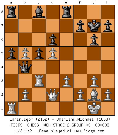 Last move : 1/2-1/2 2008 March 5 8:20:40 [Event "FICGS__CHESS__WCH_STAGE_2_GROUP_03__000003"] [Site "FICGS"] [Date "2008.01.17"] [Round "1"] [White "Larin,Igor"] [Black "Sharland,Michael"] [Result "1/2-1/2"] [WhiteElo "2152"] [BlackElo "1863"] 1.d4 Nf6 2.c4 e6 3.g3 c5 4.d5 exd5 5.cxd5 d6 6.Nc3 g6 7.Bg2 Bg7 8.Nf3 O-O 9.O-O Re8 10.Bf4 a6 11.a4 Nh5 12.Bg5 Qc7 13.Qd2 Nd7 14.Bh6 Nhf6 15.Bxg7 Kxg7 16.Rfc1 Qa5 17.Ne4 Qb6 18.Nxf6 Nxf6 19.e3 Ne4 20.Qc2 a5 21.Nd2 Nxd2 22.Qxd2 Qb4 23.Rc3 b5 24.axb5 1/2-1/2 Catalan Opening Kingside Castling by player Black (move 8) Kingside Castling by player White (move 9) This chess game ended in a draw. Follow this game move after move (download)First-class players lose to second-class players because second-class players sometimes play a first-class game. (Siegbert Tarrasch) Schach ist ein schwarz-weisser Dschungel. (Garry Kasparov) Yo he agregado estos principios a la ley: pongan los Caballos en acción antes de que los dos Alfiles sean desarrollados. (Emanuel Lasker) Les Echecs ne sont pas pour les âmes timides. Ils requièrent un homme entier, qui ne s'arrête pas aveuglément à ce qui a été déjà établi, mais qui tente individuellement de sonder les profondeurs du jeu. (W. Steinitz) The smarter you play, the luckier you'll be. (Mark Pilarski)