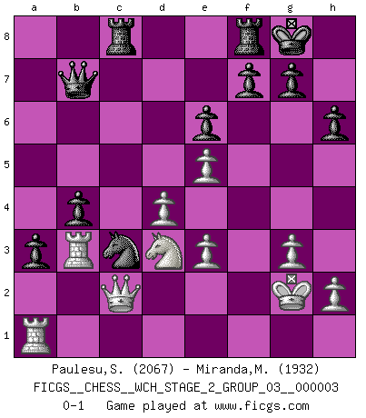Last move : 0-1 2008 May 16 9:1:24 [Event "FICGS__CHESS__WCH_STAGE_2_GROUP_03__000003"] [Site "FICGS"] [Date "2008.01.17"] [Round "1"] [White "Paulesu,Sebastiano"] [Black "Miranda,Marcus"] [Result "0-1"] [WhiteElo "2067"] [BlackElo "1932"] 1.e4 c5 2.b4 cxb4 3.a3 d5 4.e5 Nc6 5.d4 Qb6 6.Nf3 Bg4 7.Be3 e6 8.axb4 Bxb4+ 9.c3 Ba5 10.Bd3 Nge7 11.O-O Bf5 12.c4 Bxd3 13.Qxd3 dxc4 14.Qxc4 Nd5 15.Qd3 Bb4 16.Nbd2 a5 17.Qe4 Nce7 18.Nc4 Qa6 19.Rfc1 b5 20.Nb2 Bc3 21.Qb1 b4 22.Ra2 Bxb2 23.Rxb2 Nc3 24.Qc2 Ned5 25.Ra1 Rc8 26.g3 a4 27.Kg2 a3 28.Rb3 h6 29.Ne1 O-O 30.Nd3 Nxe3+ 31.fxe3 Qb7+ 0-1 Sicilian : wing gambit, Marshall variation Kingside Castling by player White (move 11) Kingside Castling by player Black (move 29) Player Black won this chess game. Follow this game move after move (download)You know you're going to lose. Even when I was ahead I knew I was going to lose. - On playing against Fischer. (Andrew Soltis) Ich moechte nie einem Club beitreten, der Leute wie mich als Mitglieder aufnimmt. (Woody Allen) Cuando veas una buena jugada, trata de encontrar otra mejor. (Emanuel Lasker) Comme les marins qui ont mille raisons différentes d'aller en mer, les joueurs d'échecs en ont tout autant avant de s'installer devant une table et jouer... (Vincent Bertignac, philosophe) Art is the triumph over chaos. (John Cheever)