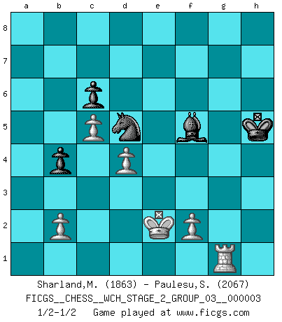 Last move : 1/2-1/2 2008 May 6 10:25:43 [Event "FICGS__CHESS__WCH_STAGE_2_GROUP_03__000003"] [Site "FICGS"] [Date "2008.01.17"] [Round "1"] [White "Sharland,Michael"] [Black "Paulesu,Sebastiano"] [Result "1/2-1/2"] [WhiteElo "1863"] [BlackElo "2067"] 1.e4 d5 2.exd5 Nf6 3.Nf3 Nxd5 4.d4 g6 5.c4 Nb6 6.Nc3 Bg7 7.c5 Nd5 8.Bc4 c6 9.O-O O-O 10.Re1 b6 11.Qb3 Nf6 12.Bg5 b5 13.Bxf7+ Rxf7 14.Ne5 Qe8 15.Nxf7 Qxf7 16.Rxe7 Qxb3 17.axb3 Bd7 18.b4 Kf8 19.Rae1 a5 20.bxa5 Rxa5 21.Bf4 Ra8 22.h4 b4 23.Na4 Rxa4 24.Bxb8 Ra1 25.Bd6 Rxe1+ 26.Rxe1 Kg8 27.Be5 Nd5 28.Bxg7 Kxg7 29.g3 Kf6 30.Ra1 Be6 31.Kf1 Kf5 32.Ra7 h5 33.Rg7 Kf6 34.Rb7 Kf5 35.Rb8 g5 36.hxg5 Kxg5 37.Ke2 h4 38.gxh4+ Kxh4 39.Rb6 Bd7 40.Rb7 Bf5 41.Rg7 Kh5 42.Rg1 1/2-1/2 Scandinavian defense Kingside Castling by player White (move 9) Kingside Castling by player Black (move 9) This chess game ended in a draw. Follow this game move after move (download)Chess is like war on a board. (Bobby Fischer) Ich hatte Angst gegen einen russischen Großmeister zu verlieren, und er befürchtete gegen einen kleinen Jungen zu verlieren. (über ein Remis gegen Juri Awerbach). (Robert James Fischer) Debió haber existido una vez en que los hombres eran semidióses, de otra manera no hubiesen podido inventar el Ajedrez. (Gustav Schenk) Si le désir cupide (et stupide) de gagner est une inépuisable source de souffrance, une combinaison brillante sur l'échiquier est une découverte : le coquelicot qui s'épanouit lorsque apparaît la Voie Lactée. (Arrabal) The various flowers seem good to different people. (Chinese proverb)