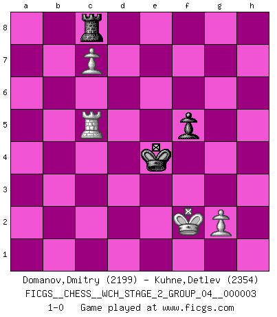 Last move : 1-0 2008 June 26 13:5:49 [Event "FICGS__CHESS__WCH_STAGE_2_GROUP_04__000003"] [Site "FICGS"] [Date "2008.01.17"] [Round "1"] [White "Domanov,Dmitry"] [Black "Kuhne,Detlev"] [Result "1-0"] [WhiteElo "2199"] [BlackElo "2354"] 1.e4 d6 2.d4 Nf6 3.Nc3 g6 4.f4 Bg7 5.Nf3 O-O 6.Bd3 Nc6 7.e5 dxe5 8.fxe5 Nd5 9.Nxd5 Qxd5 10.c3 Bg4 11.Qe2 Qd7 12.O-O f6 13.Bc4+ Kh8 14.e6 Qd6 15.h3 Bxf3 16.Rxf3 Na5 17.Bf4 Qb6 18.Bb5 c5 19.dxc5 Qxc5+ 20.Kh2 Nc6 21.Rd1 Ne5 22.Re3 Rad8 23.Bd7 Nxd7 24.exd7 e5 25.Bg3 Rf7 26.Red3 Qc4 27.Qf2 Bf8 28.Qxa7 Qc6 29.Qf2 Bc5 30.Qd2 e4 31.Rd5 e3 32.Qd3 Re7 33.b4 e2 34.Re1 Rexd7 35.Rxd7 Rxd7 36.Qxe2 Bd6 37.Bxd6 Qxd6+ 38.Kg1 Kg7 39.a4 b6 40.Qe6 Qc7 41.Kh1 Rf7 42.c4 Qa7 43.Qc6 Rd7 44.a5 bxa5 45.bxa5 Rc7 46.Qd5 h5 47.Rb1 Qa6 48.Rb5 Qc6 49.Qxc6 Rxc6 50.c5 Kh6 51.h4 g5 52.hxg5+ Kxg5 53.Kh2 Kf5 54.Kg3 Ke4 55.Rb1 Ra6 56.Rc1 Rxa5 57.c6 Ra8 58.c7 Rc8 59.Kh4 Kf5 60.Rc2 Ke6 61.Kxh5 f5 62.Kg6 Rg8+ 63.Kh6 Rc8 64.Kg5 Ke5 65.Kh4 Ke4 66.Kg3 Kd3 67.Rc5 Ke4 68.Kf2 1-0 Pirc : Austrian attack, 6.Bd3 Kingside Castling by player Black (move 5) Kingside Castling by player White (move 12) 10 pieces endgame at move 52 : White KRPPPP , Black KRPP WHITE : King + 1 Rook 4 Pawns BLACK : King + 1 Rook 2 Pawns 9 pieces endgame at move 52 : White KRPPP , Black KRPP WHITE : King + 1 Rook 3 Pawns BLACK : King + 1 Rook 2 Pawns 8 pieces endgame at move 56 : White KRPP , Black KRPP WHITE : King + 1 Rook 2 Pawns BLACK : King + 1 Rook 2 Pawns 7 pieces endgame at move 61 : White KRPP , Black KRP WHITE : King + 1 Rook 2 Pawns BLACK : King + 1 Rook 1 Pawn Player White won this chess game. Follow this game move after move (download)The essence of Chess is thinking about what Chess is. (David Bronstein) Ich bin stolz ein Bulgare zu sein. (Veselin Topalov) Una de estas pequeñas movidas modestas pudieran ser mas molestas a tu oponente que la amenaza mas grande. (Siegbert Tarrasch) Aidez vos pièces, elles vous aideront. (Paul Morphy) Programmer - an organism that turns coffee into software. (Anonymous)