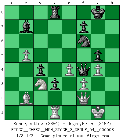 Last move : 1/2-1/2 2008 March 6 7:58:51 [Event "FICGS__CHESS__WCH_STAGE_2_GROUP_04__000003"] [Site "FICGS"] [Date "2008.01.17"] [Round "1"] [White "Kuhne,Detlev"] [Black "Unger,Peter"] [Result "1/2-1/2"] [WhiteElo "2354"] [BlackElo "2152"] 1.Nf3 Nf6 2.c4 e6 3.Nc3 d5 4.d4 c6 5.e3 Nbd7 6.Qc2 Bd6 7.Be2 O-O 8.O-O dxc4 9.Bxc4 a6 10.Rd1 b5 11.Be2 Qc7 12.e4 e5 13.g3 Re8 14.a3 h6 15.b4 a5 16.Rb1 axb4 17.axb4 Bb7 18.dxe5 Nxe5 19.Nd4 Nc4 20.Bxc4 bxc4 21.f3 Be5 22.b5 Qa5 23.Be3 c5 24.Nde2 g5 25.g4 Qc7 26.Kg2 Bxc3 27.Nxc3 Qe5 28.Bc1 h5 29.h3 hxg4 30.hxg4 Rad8 31.Bb2 Rd4 32.Kg1 Qf4 33.Qf2 Red8 34.Rxd4 cxd4 35.Rd1 d3 1/2-1/2 Reti Opening Kingside Castling by player Black (move 7) Kingside Castling by player White (move 8) This chess game ended in a draw. Follow this game move after move (download)When asked, -How is that you pick better moves than your opponents?, I responded: I'm very glad you asked me that, because, as it happens, there is a very simple answer. I think up my own moves, and I make my opponent think up his. (Alexander Alekhine) Der Umstand, daß uns eine 7 Stunden Zeitkontrolle ermöglicht eine großartige, tiefe Partie zu spielen, ist für die Massenmedien nicht weiter von Bedeutung. (Alexej Shirov) Hay jugadores fuertes y personas amables y yo soy un jugador fuerte. (Bobby Fischer) Vous n'êtes pas toujours obligé de jouer le meilleur coup. Un coup doit être actif, entreprenant, correct et beau ! (David Bronstein) O divine art of subtlety and secrecy! Through you we learn to be invisible, through you inaudible and hence we can hold the enemy's fate in our hands. (Sun Tzu)