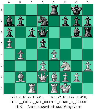 Last move : 1-0 2006 September 2 23:0:4 [Event "FICGS__CHESS__WCH_QUARTER_FINAL_3__000001"] [Site "FICGS"] [Date "2006.07.01"] [Round "6"] [White "Figlio,Gino"] [Black "Hervet,Gilles"] [Result "1-0"] [WhiteElo "2445"] [BlackElo "2490"] 1.b3 e5 2.Bb2 Nc6 3.e3 Nf6 4.Nf3 e4 5.Ne5 Nxe5 6.Bxe5 d5 7.d4 exd3 8.cxd3 Bd6 9.Bb2 O-O 10.Be2 Re8 11.O-O c6 12.Nd2 Bc7 13.Nf3 Qd6 14.h3 Bf5 15.Rc1 Nd7 16.Qd2 Re6 17.Rfd1 Rae8 18.Kf1 Bb6 19.b4 Rh6 20.e4 Bg6 21.a4 a6 22.a5 Ba7 23.Re1 1-0 Comment by player 1 : Gino Figlio : This is perhaps the only game in the match where things didn't go as planned, I had prepared 8.Bxd3, and somehow I entered the other move, which is in my opinion not as good. I was almost blitzing in the beginning, since I've played this opening many times in local cc tournaments. Black needs something quick because white is consolidating his position Comment by player 2 : Gilles Hervet : I resigned all his games because of an impossiblity to go on playing seriously. Here black stands better and the attack on the king aisle is promising. Nimzovich-Larsen attack : Modern variation Kingside Castling by player Black (move 9) Kingside Castling by player White (move 11) Player White won this chess game. Follow this game move after move (download)Suddenly it was obvious to me in my analysis I had missed what Fischer had found with the greatest of ease at the board. (Mikhail Botvinnik) Die größte Kunst beim Schach besteht darin dem Gegner nicht zu zeigen was er tun kann. (Garry Kasparov) No nos podemos resistir a la fascinación de un sacrificio ya que la pasión por los sacrificios es parte de la naturaleza de un jugador de Ajedrez. (Rudolf Spielman) Tout change constamment, y compris dans le monde des Echecs. (Botvinnik) The quality of decision is like the well-timed swoop of a falcon which enables it to strike and destroy its victim. (Sun Tzu)