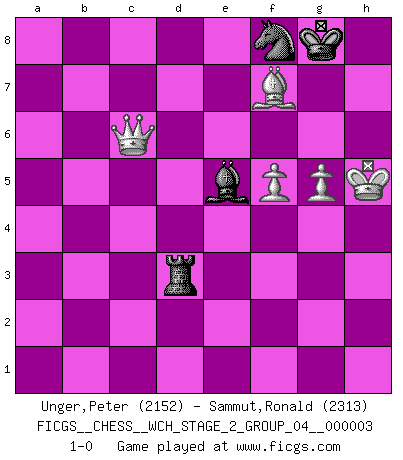 Last move : 1-0 2008 April 1 4:58:21 [Event "FICGS__CHESS__WCH_STAGE_2_GROUP_04__000003"] [Site "FICGS"] [Date "2008.01.17"] [Round "1"] [White "Unger,Peter"] [Black "Sammut,Ronald"] [Result "1-0"] [WhiteElo "2152"] [BlackElo "2313"] 1.d4 Nf6 2.Nf3 g6 3.c4 Bg7 4.Nc3 d5 5.cxd5 Nxd5 6.e4 Nxc3 7.bxc3 c5 8.Rb1 O-O 9.Be2 cxd4 10.cxd4 Qa5+ 11.Bd2 Qxa2 12.O-O Bg4 13.Bg5 h6 14.Be3 Nc6 15.d5 Na5 16.Bc5 Bf6 17.e5 Bxe5 18.Rb4 Bxf3 19.Bxf3 Rae8 20.Be3 Nc4 21.Bxh6 Nd6 22.Bxf8 Rxf8 23.Re1 Bc3 24.Ra4 Qxa4 25.Qxa4 Bxe1 26.Qxa7 Bc3 27.h4 Bf6 28.h5 gxh5 29.Bxh5 b5 30.Be2 b4 31.Qb6 Bc3 32.Qe3 Re8 33.g4 Kf8 34.Qb6 Ra8 35.Kg2 Kg7 36.f4 Ra2 37.Kf3 Rd2 38.Qa7 Rd4 39.Qxe7 Rxd5 40.Qe3 Bd2 41.Qb6 Bc3 42.g5 Rd4 43.Kg4 Kg8 44.Kh5 Rd2 45.Bf3 Nf5 46.Qc5 Ng7+ 47.Kg4 Ne6 48.Qe7 Nf8 49.Qb7 Rd6 50.Bd5 Rd7 51.Qc6 Bd4 52.f5 Be5 53.Kh5 b3 54.Bxb3 Rd3 55.Bxf7+ 1-0 King's Indian : East Indian defense Kingside Castling by player Black (move 8) Kingside Castling by player White (move 12) 10 pieces endgame at move 54 : White KQBPP , Black KRBNP WHITE : King + 1 Queen 1 Bishop 2 Pawns BLACK : King + 1 Rook 1 Bishop 1 Knight 1 Pawn 9 pieces endgame at move 55 : White KQBPP , Black KRBN WHITE : King + 1 Queen 1 Bishop 2 Pawns BLACK : King + 1 Rook 1 Bishop 1 Knight Player White won this chess game. Follow this game move after move (download)With or without the title, Bobby Fischer was unquestionably the greatest player of his time. (Burt Hochberg) Im Schach gewinnt jeder. Hat man Freunde am Spiel - und das ist die Hauptsache - ist auch der Verlust einer Partie kein Unglück. (David Bronstein) Mis oponentes también hacen buenas movidas. A veces yo no tomo esas cosas en consideración. (Bobby Fischer) Karpov est une pièce de musée. (Garry Kasparov) You can't play chess if you're groggy from pills. (Anatoly Karpov)