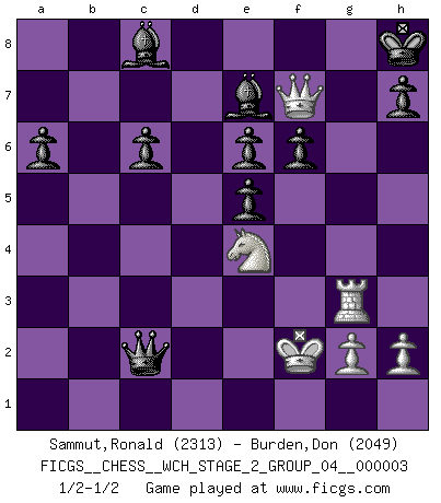 Last move : 1/2-1/2 2008 April 9 20:39:37 [Event "FICGS__CHESS__WCH_STAGE_2_GROUP_04__000003"] [Site "FICGS"] [Date "2008.01.17"] [Round "1"] [White "Sammut,Ronald"] [Black "Burden,Don"] [Result "1/2-1/2"] [WhiteElo "2313"] [BlackElo "2049"] 1.e4 c5 2.Nf3 d6 3.d4 cxd4 4.Nxd4 Nf6 5.Nc3 a6 6.Bg5 e6 7.f4 Qb6 8.Qd2 Qxb2 9.Rb1 Qa3 10.f5 Nc6 11.fxe6 fxe6 12.Nxc6 bxc6 13.e5 dxe5 14.Bxf6 gxf6 15.Ne4 Qxa2 16.Rd1 Be7 17.Be2 O-O 18.O-O Ra7 19.Rf3 Rd7 20.Rg3+ Kh8 21.Qh6 Rxd1+ 22.Bxd1 Rf7 23.Qh5 Qa5 24.Kf1 Qd8 25.Qxf7 Qxd1+ 26.Kf2 Qxc2+ 1/2-1/2 Sicilian : Najdorf, 7...Qb6 Kingside Castling by player Black (move 17) Kingside Castling by player White (move 18) This chess game ended in a draw. Follow this game move after move (download)Chess is a forcing house where the fruits of character can ripen more fully than in life. (Edward Morgan Foster) Du weisst es gibt ein Problem mit Computern und Fernschach, wenn jeder eine Rating von 2450 hat. (John Christen Knudsen) El Ajedrez no es como la vida... ¡tiene reglas!. (Mark Pasternak) La vie et les Echecs sont tous les deux une lutte constante. (Lasker) I think your argument is specious - I think your tie is ugly. (Gregory House to Dr. Foreman, House M.D.)