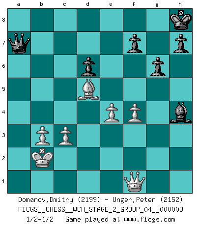 Last move : 1/2-1/2 2008 February 19 17:1:10 [Event "FICGS__CHESS__WCH_STAGE_2_GROUP_04__000003"] [Site "FICGS"] [Date "2008.01.17"] [Round "1"] [White "Domanov,Dmitry"] [Black "Unger,Peter"] [Result "1/2-1/2"] [WhiteElo "2199"] [BlackElo "2152"] 1.e4 c5 2.Nf3 Nc6 3.d4 cxd4 4.Nxd4 Nf6 5.Nc3 e5 6.Ndb5 d6 7.Bg5 a6 8.Na3 b5 9.Nd5 Be7 10.Bxf6 Bxf6 11.c3 O-O 12.Nc2 Bg5 13.a4 bxa4 14.Rxa4 a5 15.Bc4 Rb8 16.b3 Kh8 17.Nce3 g6 18.h4 Bxh4 19.g3 Bg5 20.f4 exf4 21.gxf4 Bh4+ 22.Kd2 Ne7 23.Kc1 Nxd5 24.Nxd5 Be6 25.Ra2 Bxd5 26.Qxd5 Qf6 27.Qd2 Bg3 28.Rf1 Bh4 29.Rxa5 Qe7 30.Qd3 Ra8 31.Rxa8 Rxa8 32.Bd5 Ra1+ 33.Kb2 Rxf1 34.Qxf1 Qa7 1/2-1/2 Sicilian : Pelikan (Lasker/Sveshnikov) variation Kingside Castling by player Black (move 11) This chess game ended in a draw. Follow this game move after move (download)It began to feel as though you were playing against Chess itself. - On playing against Robert Fischer. (Walter Shipman) Wenn Capablanka heute auf der Schachbühne erscheinen würde, hätte er ein halbes Jahr gebraucht um sich die Schachtheorie anzueignen. Und dann hätte er alles und jeden besiegt. (Mikhail Moiseyevich Botvinik) El Ajedrez es sobre todo, ¡una pelea!. (Emanuel Lasker) L'ordinateur a tué l'originalité. Il n'y a plus guère d'aventures sur l'échiquier. (Jacob Murray) You have to believe in yourself. (Sun Tzu)