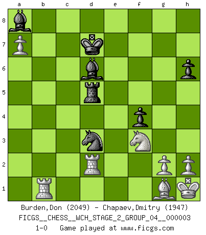 Last move : 1-0 2008 June 7 11:53:26 [Event "FICGS__CHESS__WCH_STAGE_2_GROUP_04__000003"] [Site "FICGS"] [Date "2008.01.17"] [Round "1"] [White "Burden,Don"] [Black "Chapaev,Dmitry"] [Result "1-0"] [WhiteElo "2049"] [BlackElo "1947"] 1.d4 d5 2.Nf3 Nf6 3.c4 c6 4.e3 e6 5.Nc3 Nbd7 6.Bd3 dxc4 7.Bxc4 b5 8.Be2 Bb7 9.O-O a6 10.e4 c5 11.e5 Nd5 12.a4 b4 13.Ne4 Qc7 14.Qd3 Be7 15.Bd2 a5 16.Bg5 f5 17.exf6 gxf6 18.Bh6 Rg8 19.dxc5 Rg6 20.Qd2 Nc3 21.bxc3 Bxe4 22.cxb4 axb4 23.Nh4 Rg8 24.Rfd1 b3 25.Qe3 Qe5 26.Qxb3 Nxc5 27.Qb5+ Kf7 28.f4 Qb8 29.Bh5+ Bg6 30.f5 exf5 31.Qc4+ Ne6 32.Bf3 Ra5 33.Bd5 Rxd5 34.Qxd5 f4 35.Re1 Qd6 36.Qa2 Bd3 37.Kh1 Rd8 38.Bxf4 Qd5 39.Qxd5 Rxd5 40.Be3 f5 41.Nf3 Be4 42.Bb6 h6 43.a5 Rb5 44.Nd2 Ba8 45.Rab1 Rd5 46.Nc4 Nf4 47.Ne5+ Kf6 48.Nf3 Nd3 49.Red1 Bd6 50.a6 Ke7 51.a7 Kd7 52.Bg1 f4 53.Rd2 1-0 This chess game has been lost on time (started : 2008.01.17 3:54:57) Queen's pawn game Kingside Castling by player White (move 9) Player White won this chess game. Follow this game move after move (download)When you play Bobby, it is not a question if you win or lose. It is a question if you survive. (Boris Spassky) Du musst Deinen Gegner in einen tiefen dunklen Wald führen wo 2+2=5 ist und wo der Weg, der wieder hinausführt, nur breit genug für einen ist. (Mikhail Nekhemyevich Tal) El Ajedrez se juega con la mente... ¡no con las manos!. (Renaud y Kahn) Mais l'homme est une créature légère et illogique : semblable au joueur d'échecs, il n'aime que le processus du but à atteindre, non le but lui-même. (Dostoïevsky) There is no vagueness without wind. (Chinese proverb)