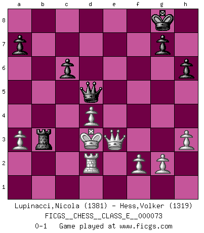 Last move : 0-1 2008 February 13 12:31:3 [Event "FICGS__CHESS__CLASS_E__000073"] [Site "FICGS"] [Date "2008.01.17"] [Round "1"] [White "Lupinacci,Nicola"] [Black "Hess,Volker"] [Result "0-1"] [WhiteElo "1381"] [BlackElo "1319"] 1.d4 d5 2.c4 e6 3.Nc3 Nf6 4.Bg5 Be7 5.Nf3 h6 6.Bh4 Ne4 7.Bxe7 Qxe7 8.cxd5 Nxc3 9.bxc3 exd5 10.e3 O-O 11.Qb3 c6 12.h3 f5 13.Ne5 Qf6 14.c4 f4 15.cxd5 fxe3 16.dxc6 Be6 17.Qxe3 Nxc6 18.Nxc6 bxc6 19.a3 Rab8 20.O-O-O Ba2 21.Rd2 Rb1+ 22.Kc2 Rfb8 23.Bc4+ Bxc4 24.Rxb1 Qf5+ 25.Kc3 Rxb1 26.Kxc4 Qd5+ 27.Kd3 Rb3+ 0-1 QGD : 4.Bg5 Be7 Kingside Castling by player Black (move 10) Queenside Castling by player White (move 20) Player Black won this chess game. Follow this game move after move (download)Chess is imagination. (David Bronstein) Sicherlich können nur Meister einen Stil haben. Daß ein nicht-Meister auch nur ein einziges Mal in seinem Leben eine Partie folgerecht durchführte, habe ich niemals bemerkt. (Emanuel Lasker) El Ajedrez es un terrible juego. Si no controlas el centro, tu oponente tiene una posición mas holgada. Si tienes control del centro, ¡entonces realmente tu tienes algo de que preocuparte!. (Siegbert Tarrasch) Aidez vos pièces, elles vous aideront. (Paul Morphy) If you are going through hell, keep going. (Winston Churchill)