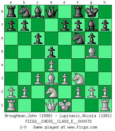 Last move : 1-0 2008 April 12 7:31:35 [Event "FICGS__CHESS__CLASS_E__000073"] [Site "FICGS"] [Date "2008.01.17"] [Round "1"] [White "Broughman,John"] [Black "Lupinacci,Nicola"] [Result "1-0"] [WhiteElo "1588"] [BlackElo "1381"] 1.d4 Nf6 2.Nf3 g6 3.Bg5 Bg7 4.Nbd2 d5 5.e3 O-O 6.Bd3 c6 7.c3 1-0 This chess game has been lost on time (started : 2008.01.17 10:38:2) King's Indian : Torre attack Kingside Castling by player Black (move 5) Player White won this chess game. Follow this game move after move (download)Before the endgame, the Gods have placed the middle game. (Siegbert Tarrasch) Ich spiele 70 Eröffnungssysteme. (Viktor Kortschnoi) Aún deseo matar a Fischer. (Boris Spassky) Le jeu d'échecs est comme rejeté hors du temps. (Antoine de Saint-Exupéry) Pretend inferiority and encourage his arrogance. (Sun Tzu)