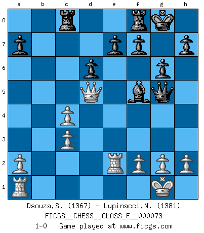 Last move : 1-0 2008 May 2 21:6:7 [Event "FICGS__CHESS__CLASS_E__000073"] [Site "FICGS"] [Date "2008.01.17"] [Round "1"] [White "Dsouza,Stanislaus"] [Black "Lupinacci,Nicola"] [Result "1-0"] [WhiteElo "1367"] [BlackElo "1381"] 1.d4 Nf6 2.c4 g6 3.Bg5 Bg7 4.e3 c5 5.Be2 Qa5+ 6.Nc3 Ne4 7.Qc2 Nxg5 8.Nf3 Nxf3+ 9.Bxf3 cxd4 10.exd4 Bxd4 11.O-O Bxc3 12.bxc3 Nc6 13.Bd5 d6 14.Bxc6+ bxc6 15.Rfe1 Qg5 16.Re2 Bf5 17.Qa4 O-O 18.Qxc6 Rac8 19.Qd5 1-0 King's Indian defense Kingside Castling by player White (move 11) Kingside Castling by player Black (move 17) Player White won this chess game. Follow this game move after move (download)I like to say that Bobby Fischer was the greatest player ever. But what made Fischer a genius was his ability to blend an American freshness and pragmatism with Russian ideas about strategy. (Bruce Pandolfini) Das typische an einem Großmeister ist, daß er eine gewonnene Position schnell und schmerzlos gewinnt. (Irving Chernev) Yo nunca en mi vida he jugado la Defensa Francesa, que viene siendo la más aburrida de todas las Aperturas. (Wilhelm Steinitz) Que feriez-vous si vous étiez en train de jouer aux échecs et que la fin du monde arrive ? Je continuerais à jouer. (Saint Borromée) If passion drives you, let reason holds the reins. (Benjamin Franklin)