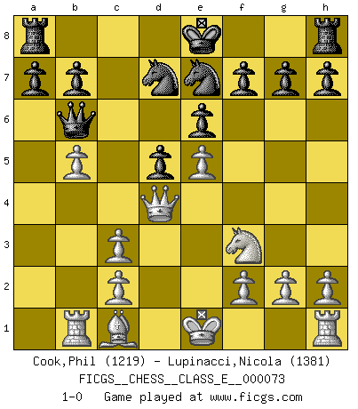 Last move : 1-0 2008 April 28 20:50:43 [Event "FICGS__CHESS__CLASS_E__000073"] [Site "FICGS"] [Date "2008.01.17"] [Round "1"] [White "Cook,Phil"] [Black "Lupinacci,Nicola"] [Result "1-0"] [WhiteElo "1219"] [BlackElo "1381"] 1.e4 e6 2.d4 d5 3.Nc3 Bb4 4.e5 c5 5.a3 Bxc3+ 6.bxc3 Ne7 7.Bb5+ Bd7 8.a4 Bxb5 9.axb5 Qb6 10.Rb1 cxd4 11.Qxd4 Nd7 12.Nf3 1-0 French : Winawer, Advance, 6...Ne7 Player White won this chess game. Follow this game move after move (download)I prefer to lose a really good game than to win a bad one. (David Levy) Karpov ist ein Museumsstück. (Garry Kasparov) Del Ajedrez se ha dicho que la vida no es lo suficientemente larga para él, pero eso es culpa de la vida, no del Ajedrez. (William Ewart Napier) Les Echecs sont affaire de jugement sensible. Savoir quand frapper et quand esquiver. (Fischer) In theory there is no difference between theory and practice. In practice there is. (Yogi Berra)
