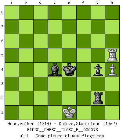 Last move : 0-1 2008 February 26 14:12:40 [Event "FICGS__CHESS__CLASS_E__000073"] [Site "FICGS"] [Date "2008.01.17"] [Round "1"] [White "Hess,Volker"] [Black "Dsouza,Stanislaus"] [Result "0-1"] [WhiteElo "1319"] [BlackElo "1367"] 1.e4 c5 2.c3 d5 3.exd5 Qxd5 4.d4 cxd4 5.Qxd4 Qxd4 6.cxd4 Nf6 7.Nf3 Nc6 8.Bc4 h6 9.Ne5 Nxe5 10.dxe5 Nd7 11.e6 fxe6 12.Bxe6 g5 13.O-O Nc5 14.Bxc8 Rxc8 15.Nc3 Nd3 16.Be3 Nxb2 17.Bxa7 Nc4 18.Nd5 Nd6 19.Rac1 Rxc1 20.Rxc1 Bg7 21.Bb6 Rf8 22.Re1 Rf7 23.Nc7+ Kd7 24.a4 Kc6 25.a5 Nc8 26.Rc1+ Kd7 27.Ne8 Nxb6 28.axb6 Kxe8 29.Rc8+ Kd7 30.Rc7+ Kd8 31.Rxb7 Bd4 32.Rb8+ Kd7 33.Kf1 Rxf2+ 34.Ke1 Rxg2 35.Rb7+ Kc6 36.Rxe7 Kxb6 37.Re6+ Kc5 38.Rxh6 g4 39.h4 Kd5 40.Rh5+ Ke4 0-1 Sicilian : Alapin's variation (2.c3) Kingside Castling by player White (move 13) 10 pieces endgame at move 34 : White KRPP , Black KRBPPP WHITE : King + 1 Rook 2 Pawns BLACK : King + 1 Rook 1 Bishop 3 Pawns 9 pieces endgame at move 36 : White KRPP , Black KRBPP WHITE : King + 1 Rook 2 Pawns BLACK : King + 1 Rook 1 Bishop 2 Pawns 8 pieces endgame at move 36 : White KRP , Black KRBPP WHITE : King + 1 Rook 1 Pawn BLACK : King + 1 Rook 1 Bishop 2 Pawns 7 pieces endgame at move 38 : White KRP , Black KRBP WHITE : King + 1 Rook 1 Pawn BLACK : King + 1 Rook 1 Bishop 1 Pawn Player Black won this chess game. Follow this game move after move (download)My God, Bobby Fischer plays so simply. (Alexei Suetin) Auf jeden Fall musst du zuerst Rechtsanwalt werden, damit du deine eigenen Interessen und die deiner Familie vertreten kannst. [Brief an seinen Sohn] (José Raúl Capablanca) El Ajedrez es de 30 a 40 por ciento psicología. Uno no cuenta con esto cuando se juega contra una computadora. No lo puedo confundir. (Judith Polgar) Les Echecs représentent une sphère d'idées créatrices basée sur la volonté des deux protagonistes. (Smyslov) Hold em is to stud what chess is to checkers. (Johnny Moss)