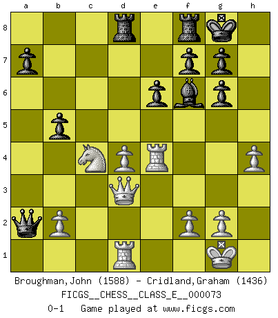 Last move : 0-1 2008 May 18 22:13:15 [Event "FICGS__CHESS__CLASS_E__000073"] [Site "FICGS"] [Date "2008.01.17"] [Round "1"] [White "Broughman,John"] [Black "Cridland,Graham"] [Result "0-1"] [WhiteElo "1588"] [BlackElo "1436"] 1.d4 Nf6 2.Nf3 c6 3.e3 d5 4.Bd3 Bg4 5.Nbd2 e6 6.h3 Bh5 7.c3 Nbd7 8.e4 dxe4 9.Nxe4 Nxe4 10.Bxe4 Nf6 11.Bg5 Be7 12.Bxf6 Bxf6 13.O-O O-O 14.Qd3 Bg6 15.Bxg6 hxg6 16.Rfe1 Qd6 17.Ne5 Rad8 18.Rad1 c5 19.Re4 cxd4 20.Nc4 Qa6 21.cxd4 Qxa2 22.h4 b5 0-1 Queen's pawn game Kingside Castling by player White (move 13) Kingside Castling by player Black (move 13) Player Black won this chess game. Follow this game move after move (download)I thought the most common mistake [in chess] was the first one: Learning the game :P (Garvin Gray, FICGS forum) Es tut gut, die Entwicklungsperiode von, [...] demokratischem Geist durchdringen zu lassen. Wie undemokratisch wäre es doch beispielsweise, den einen Offizier große Spaziertouren vornehmen zu lassen, während die anderen zu Hause säßen und sich entsetzlich langweilten. (Aaron Nimzowitsch) Si el Ajedrez es una ciencia, es la mas inexacta. Si el Ajedrez es un arte, es demasiado inexacto para ser visto como tal. Si el Ajedrez es un deporte, es demasiado esotérico. Si el Ajedrez es un juego, es demasiado exigente para ser solo un juego. Si el Ajedrez es una aventura, es una muy demandante. Si el Ajedrez es una pasión, es una muy gratificante. Si el Ajedrez es la vida, es una muy triste. (Anónimo) Nous sommes les pions de la mystérieuse partie d'Echecs jouée par Dieu. Il nous déplace, nous arrête, nous pousse encore, puis nous lance un à un dans la boîte du Néant. Epitaphe sur la tombe de David Janowsky (1868-1927). Methinks King Thibault should dub Marius Zubac a knight of the square board... I mean table, henceforth addressing him as Sir Marius, and bestow on him a suitable land from the kingdom of FICGS & marry him off to a worthy, fair maiden, lest he slice our heads with his mighty sword in his wrath. (Dinesh De Silva)