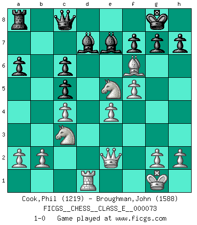 Last move : 1-0 2008 April 29 8:55:33 [Event "FICGS__CHESS__CLASS_E__000073"] [Site "FICGS"] [Date "2008.01.17"] [Round "1"] [White "Cook,Phil"] [Black "Broughman,John"] [Result "1-0"] [WhiteElo "1219"] [BlackElo "1588"] 1.e4 c5 2.Nf3 d6 3.Bb5+ Nc6 4.d4 Bd7 5.dxc5 dxc5 6.c4 e5 7.O-O Nf6 8.Bg5 Be7 9.Nc3 O-O 10.Qd2 a6 11.Bxc6 bxc6 12.Nxe5 Be6 13.Rfd1 Qc7 14.f4 Rfd8 15.Qe2 Rxd1+ 16.Rxd1 Qc8 17.f5 Bd7 18.Bxf6 1-0 This chess game has been lost on time (started : 2008.01.17 10:38:2) Sicilian : Canal-Sokolsky (Nimzovich-Rossolimo, Moscow) attack Kingside Castling by player White (move 7) Kingside Castling by player Black (move 9) Player White won this chess game. Follow this game move after move (download)On the chessboard, lies and hypocrisy do not survive long. (Emanuel Lasker) Stelle das Brett so, daß die Sonne in die Augen deines Gegners scheint. (Ruy López) Yo siempre he tenido un ligero sentimiento de lástima por una persona que no tiene conocimiento del Ajedrez. (Siegbert Tarrasch) En blitz, le Cavalier l'emporte sur le Fou. (Vlastimil Hort) Success without honor is an unseasoned dish; it will satisfy your hunger, but it won't taste good. (Joe Paterno)