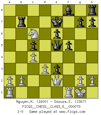 Last move : 1-0 2008 March 17 12:29:24 [Event "FICGS__CHESS__CLASS_E__000073"] [Site "FICGS"] [Date "2008.01.17"] [Round "1"] [White "Nguyen,Hao Nhien"] [Black "Dsouza,Stanislaus"] [Result "1-0"] [WhiteElo "1600"] [BlackElo "1367"] 1.e4 c5 2.f4 Nc6 3.Nf3 d5 4.e5 Bg4 5.Be2 Bxf3 6.Bxf3 e6 7.O-O Nge7 8.c3 d4 9.d3 Nd5 10.c4 Ne3 11.Bxe3 dxe3 12.Bxc6+ Ke7 13.Be4 f6 14.Nc3 f5 15.Bf3 Qd4 16.Qe2 Rb8 17.Nb5 Qxf4 18.Nxa7 Qxe5 19.Bxb7 Rxb7 20.Nc6+ 1-0 Sicilian : Grand Prix attack Kingside Castling by player White (move 7) Player White won this chess game. Follow this game move after move (download)The defensive power of a pinned piece is only imaginary. (Aaron Nimzovich) Der Schachmeister von Heute braucht Courage, einen Killerinstinkt, Ausdauer und Arroganz. (Larry Evans) De todos mis libros Rusos, la defensa contiene y difunde el 'calor' mas grande que pudiese verse extraño al observar lo supremamente abstracto que el Ajedrez supuestamente es. (Vladimir Nabokov) Je ne suis pas le dernier à jouer lâchement des coups douteux pendant le zeïtnot de l'adversaire pour l'achever: en effet les coups qui font le plus peur sont ceux que l'on ne comprend pas. Je me fais souvent peur quand je joue. (Un professeur anonyme) Chess is as much a mystery as women. (Purdy)